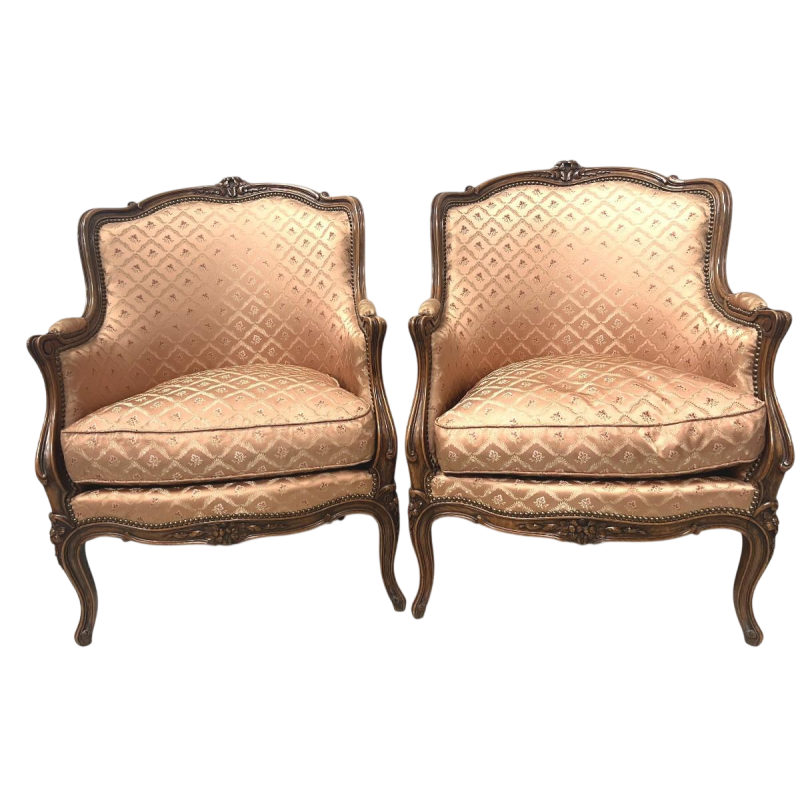 Een paar bergère fauteuils in Louis XV-stijl, vervaardigd uit natuurlijk hout – 20e eeuw