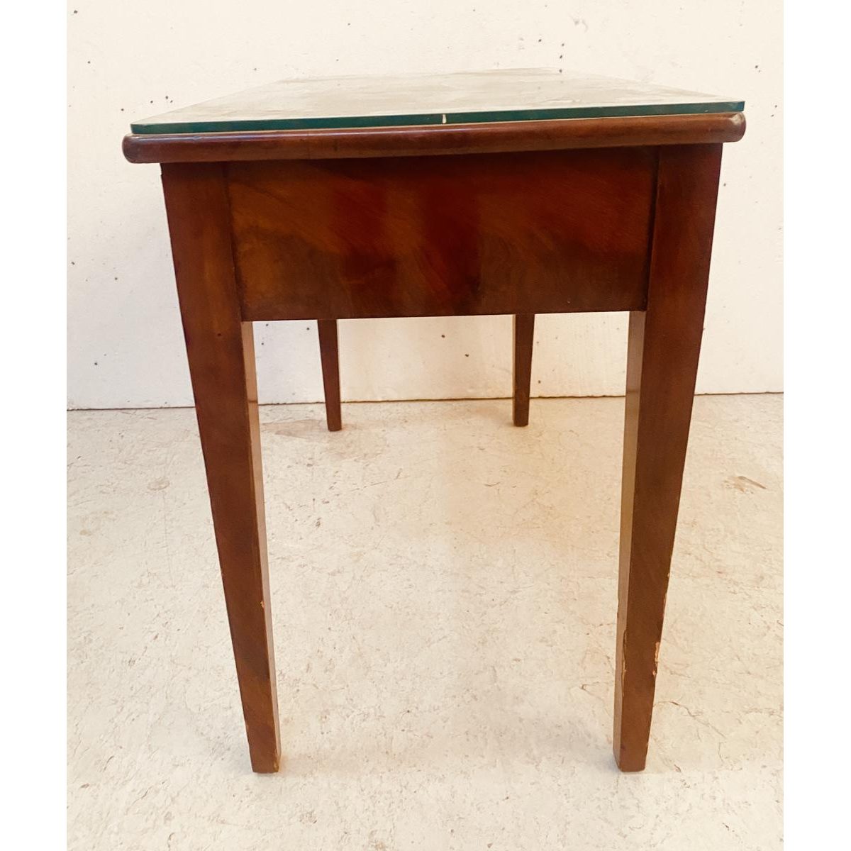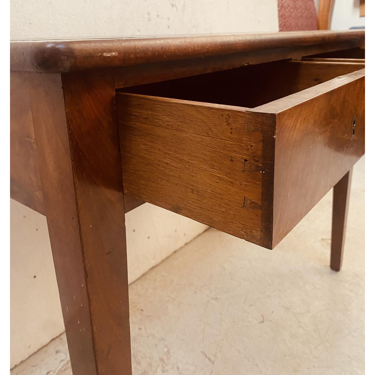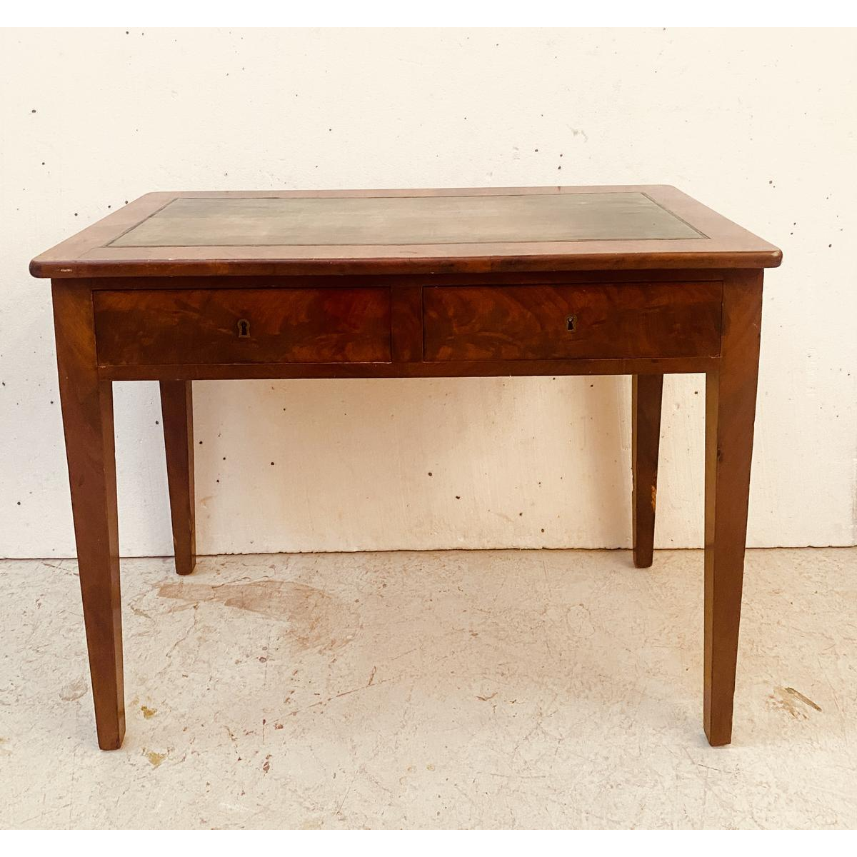 Klein, plat bureau in de Directoire-stijl, met twee lades aan de voorkant, kegelvormige poten, een blad van hout en leer en een verweerde gouden afwerking.