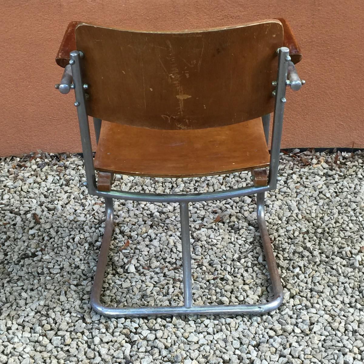 Modernistische bureaustoel/fauteuil, gemaakt rond 1930, zitting en rugleuning van gelamineerd en thermisch gevormd multiplex, frame en poten van verchroomd staal met schroeven. Mogelijk een prototype...