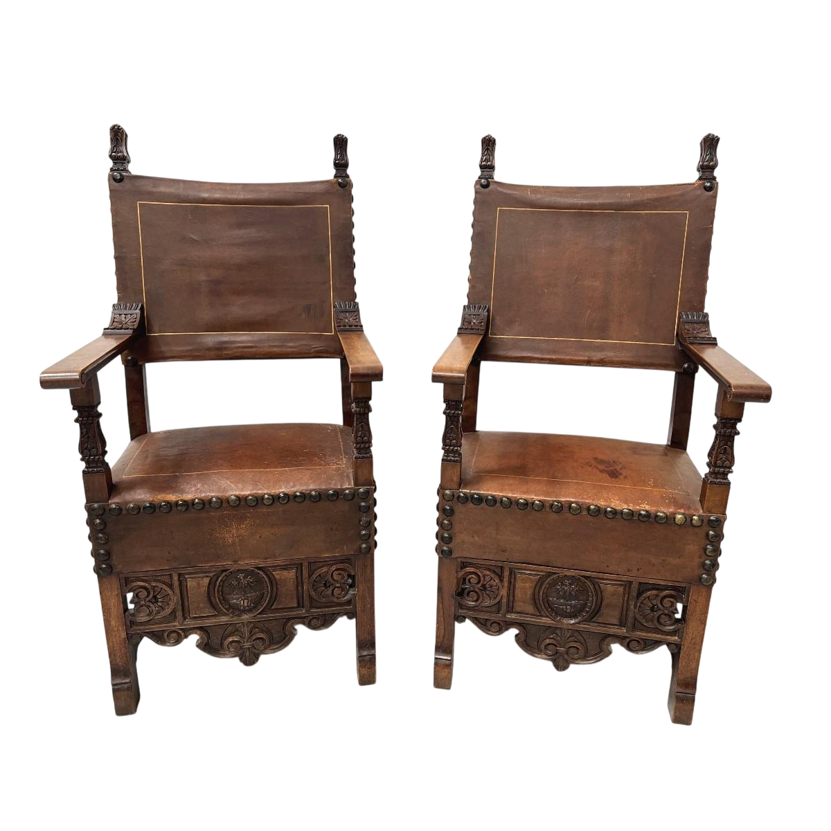 Een paar notenhouten fauteuils in renaissancestijl, eind 19e – begin 20e eeuw.