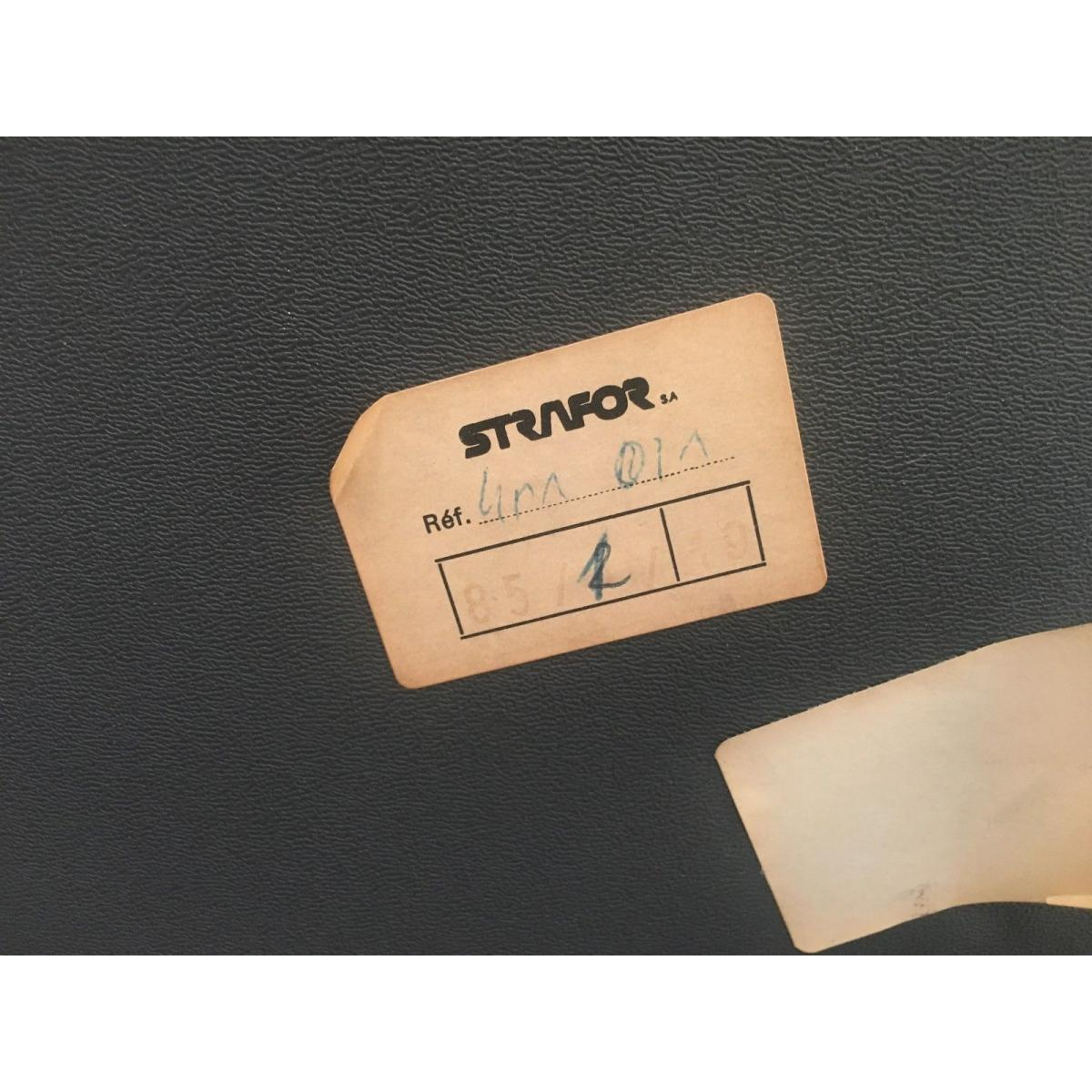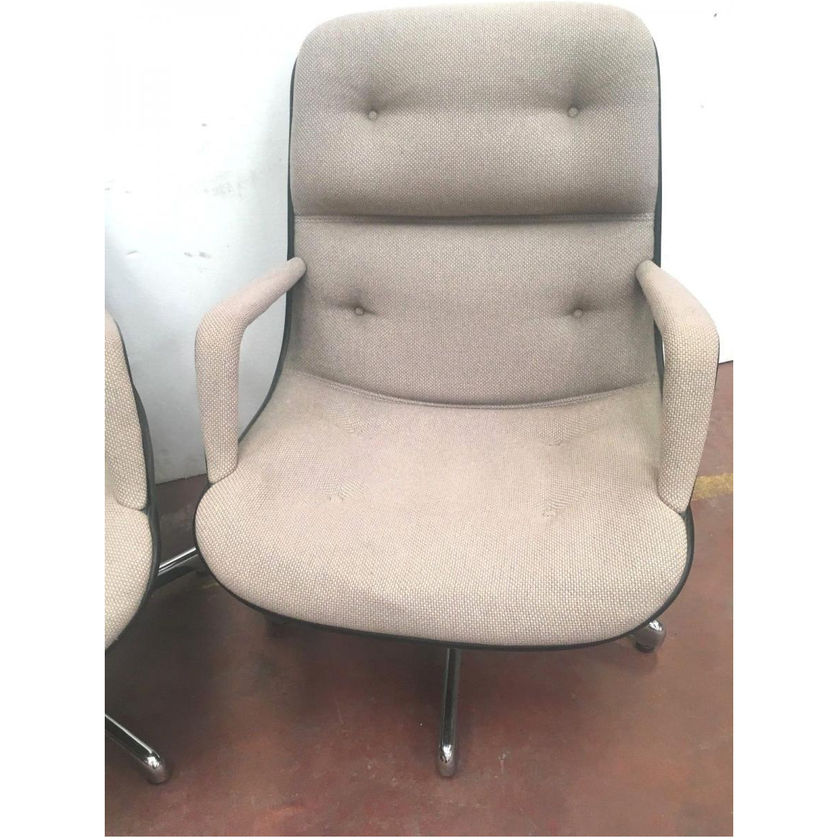 Een paar Strafor directiestoelen. Een zeer fraai paar vintage Strafor directiestoelen in de stijl van Charles Pollock. Donkergrijze kunststof schaal. Beige tweed gestoffeerde zitting en rugleuning. Gestoffeerde armleuningen. Vijfsterren verchroomd metalen onderstel met zwarte kunststof dopjes. Draaibare stoelen. Gefabriceerd in de jaren 70/80. Het originele label met serienummer is nog aanwezig. In zeer goede staat. Zeer comfortabele stoel. Afmetingen: H 85 x B 64 x D 48 cm. Zithoogte: 42 cm.