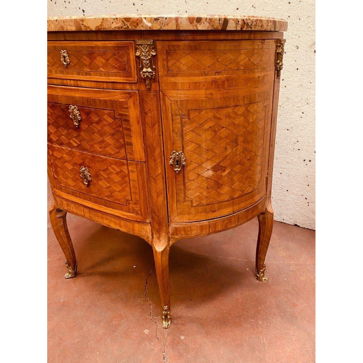 Halvemaanvormige commode in Lodewijk XVI-stijl met marqueterie en kubusvormige voet – 20e eeuw