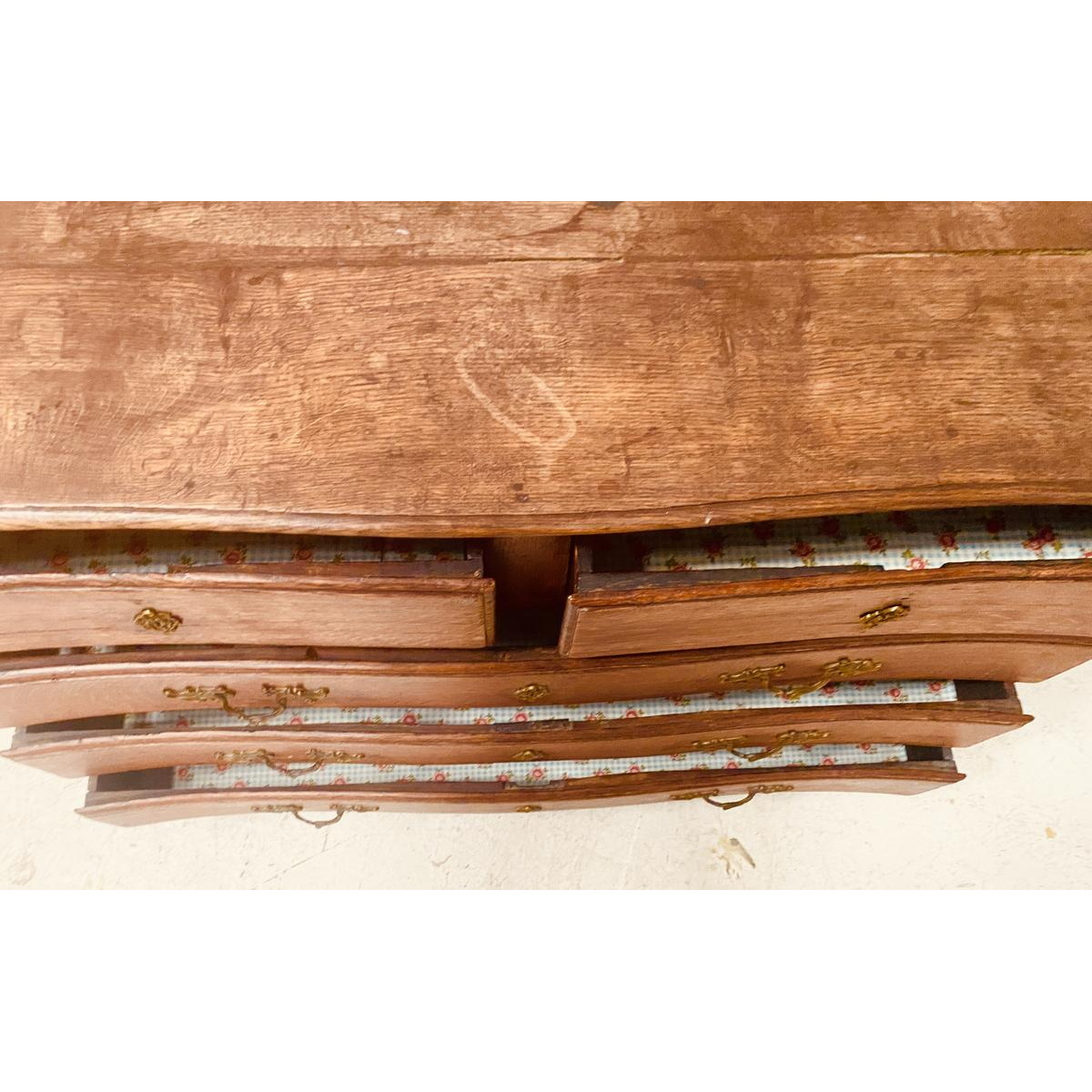 Vijf laden aan de voorzijde met messing handgrepen en sleutelgatplaatjes.