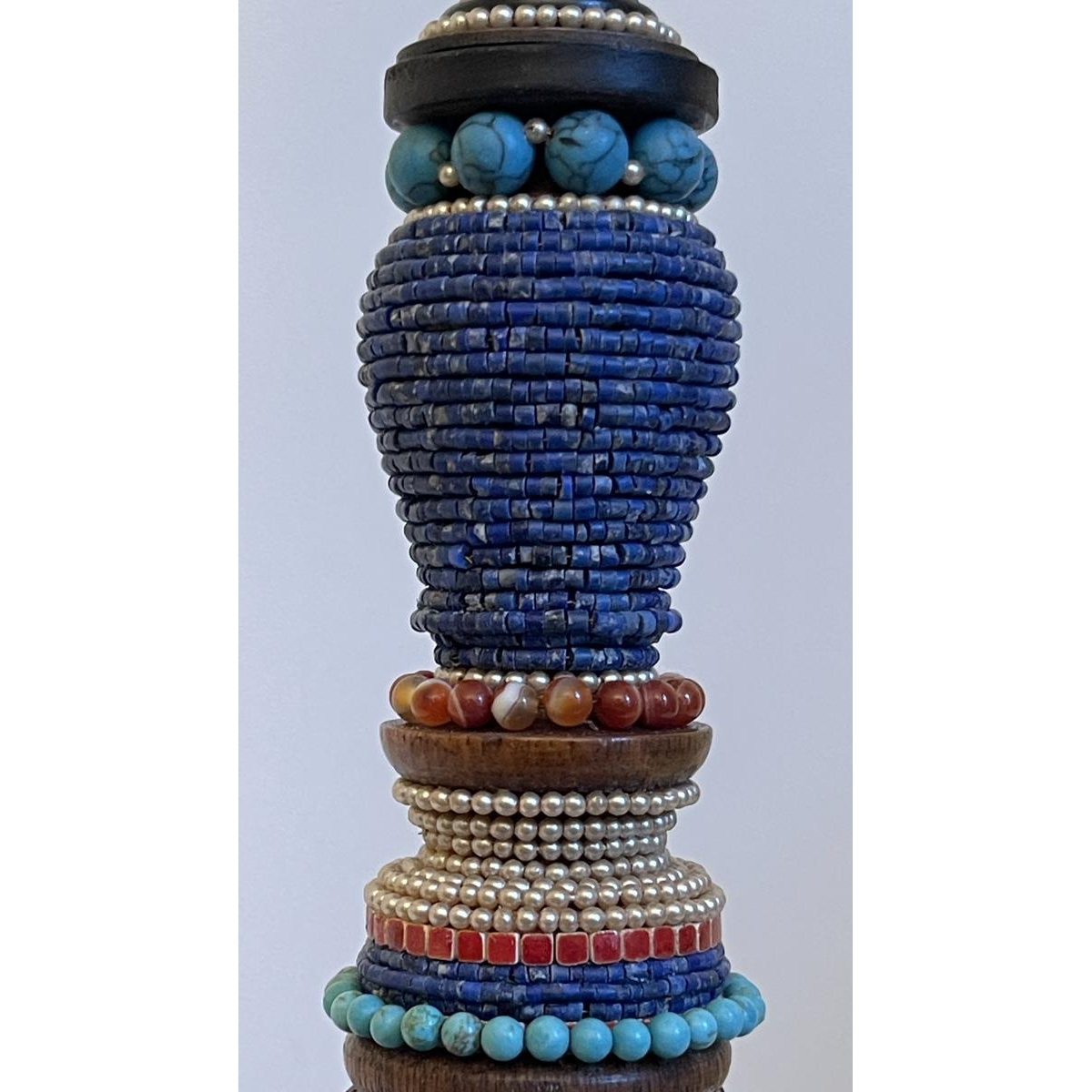 De kolom is samengesteld uit antieke halskettingkralen, lapis lazuli- en malachietkralen en keramische elementen uit Caror, waarvan het gladde, dichte oppervlak contrasteert met de diversiteit aan texturen eromheen. Halverwege vormt een verzameling kleine cabochons, versierd met familieportretten uit het einde van de 19e of het begin van de 20e eeuw, een cirkelvormige ring. Deze miniatuurgezichten introduceren een discrete, gefragmenteerde, bijna anonieme menselijke dimensie, die eerder in de logica van de compositie is geïntegreerd dan expressief.