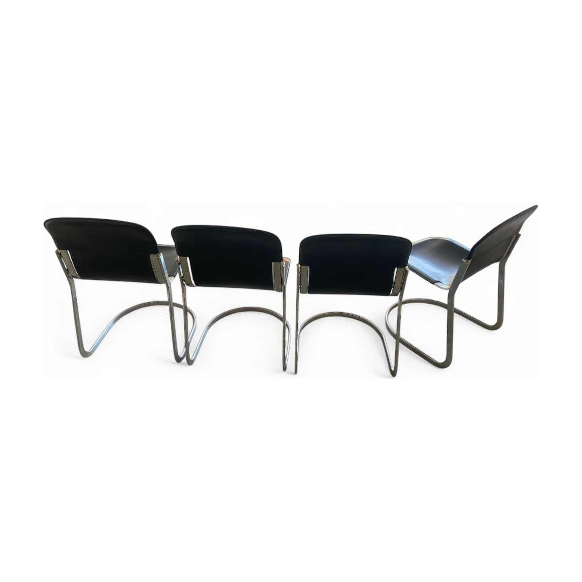 Willy Rizzo voor Cidue, set van 4 vintage designstoelen, zwart leer en verchroomd staal, ca 1970