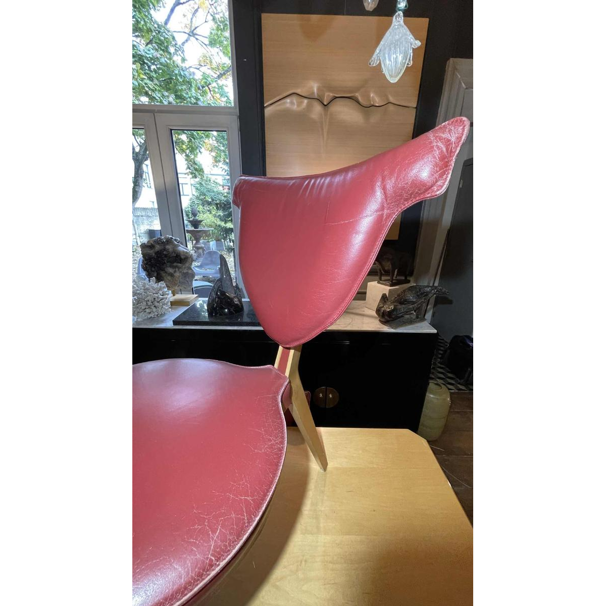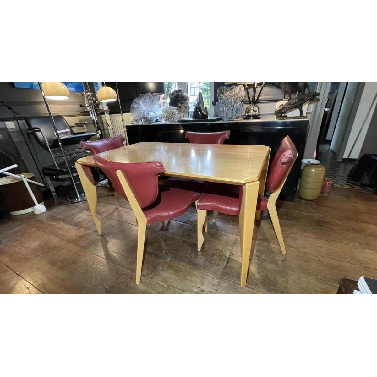 Gemaakt van esdoornhout, gietijzer geschilderd bordeaux en bordeaux leer, deze eethoek is kwalitatief.