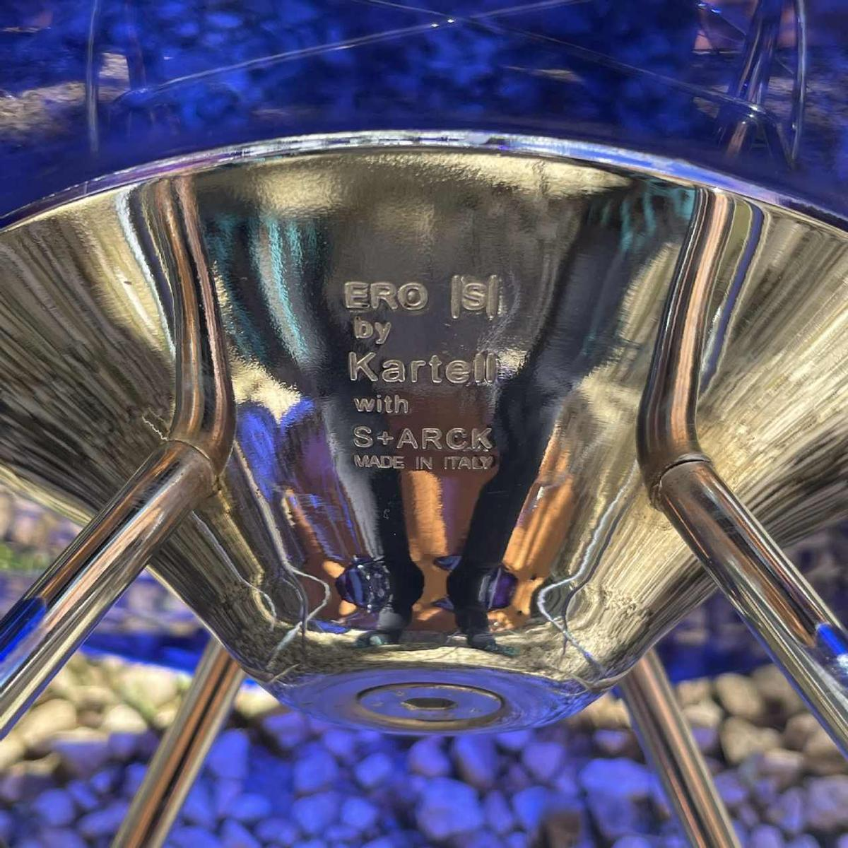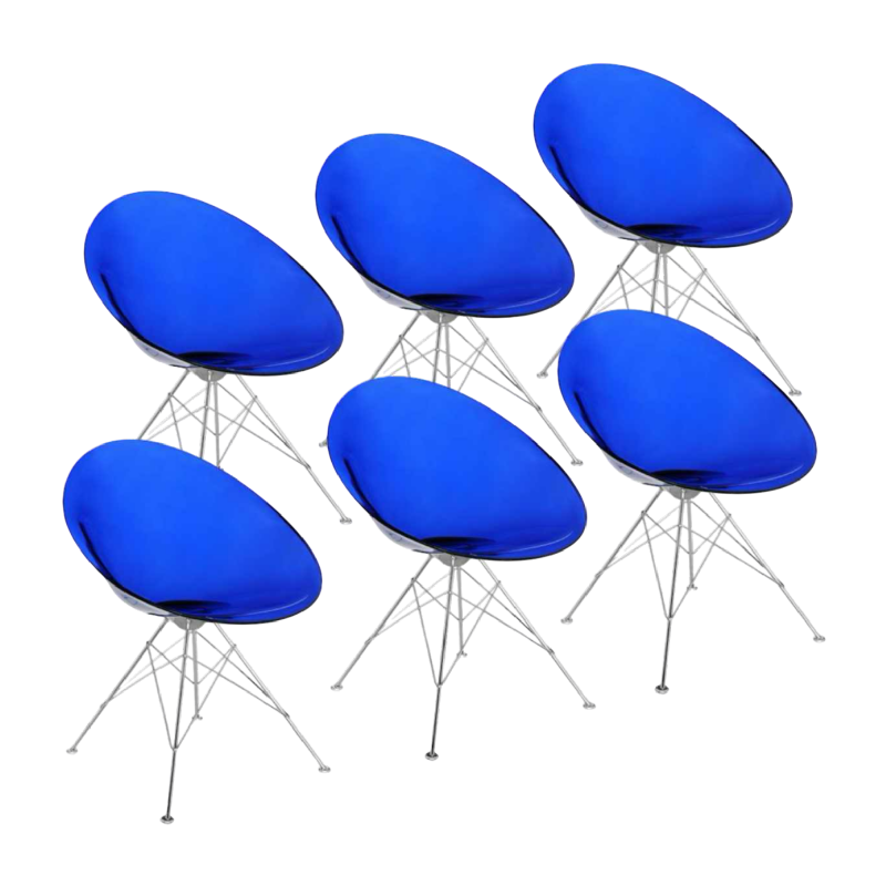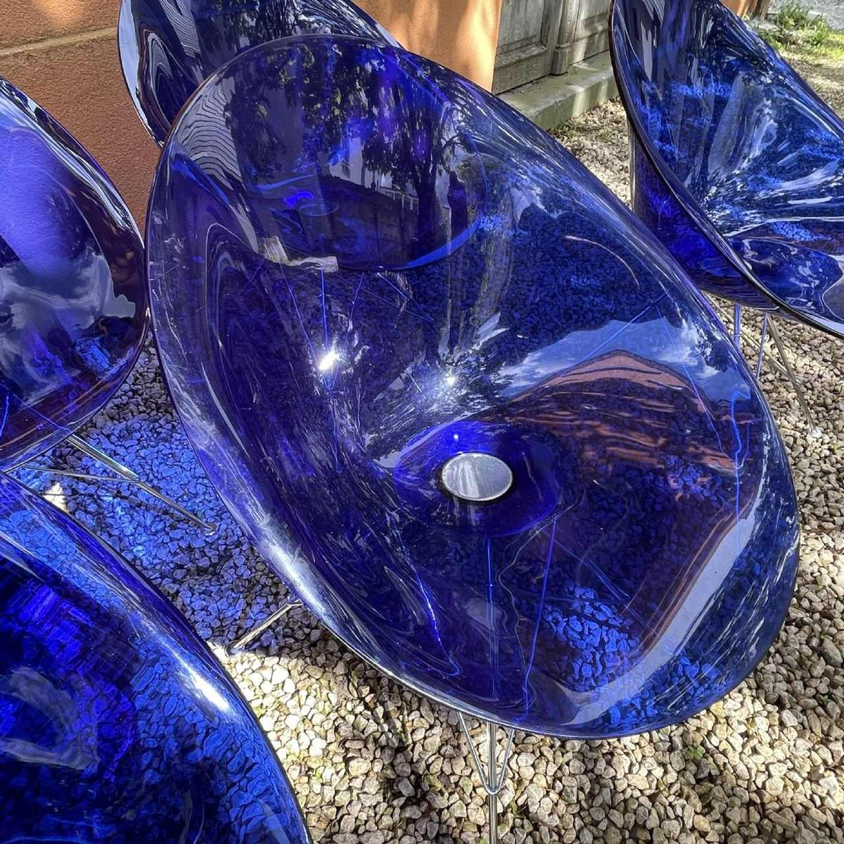 Serie van 6 "ERO S" stoelen met kathedraal onderstel in verchroomd staal en eivormige zitting in blauw polycarbonaat ontworpen door Philippe Starck, uitgegeven door Kartell Italië in 1999.