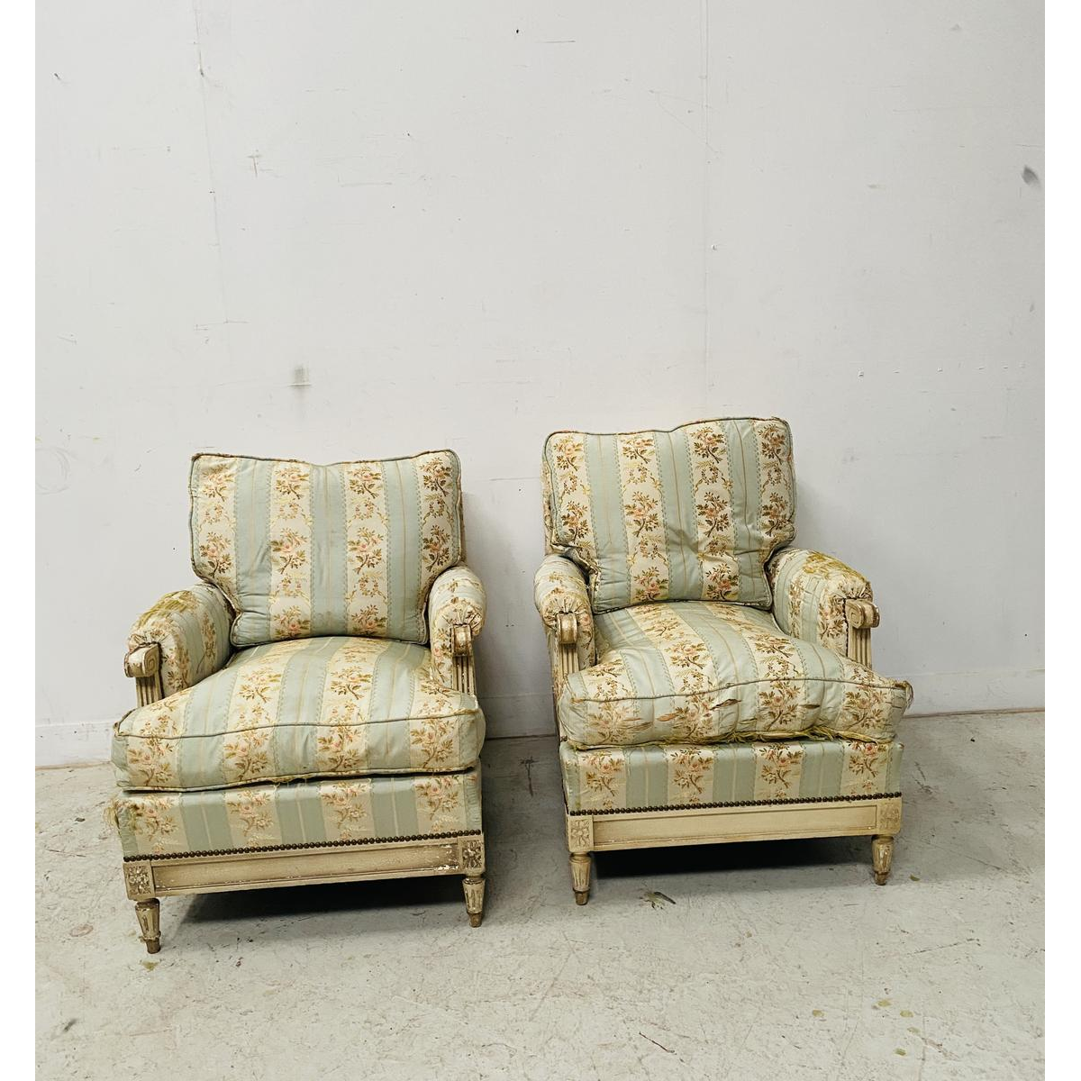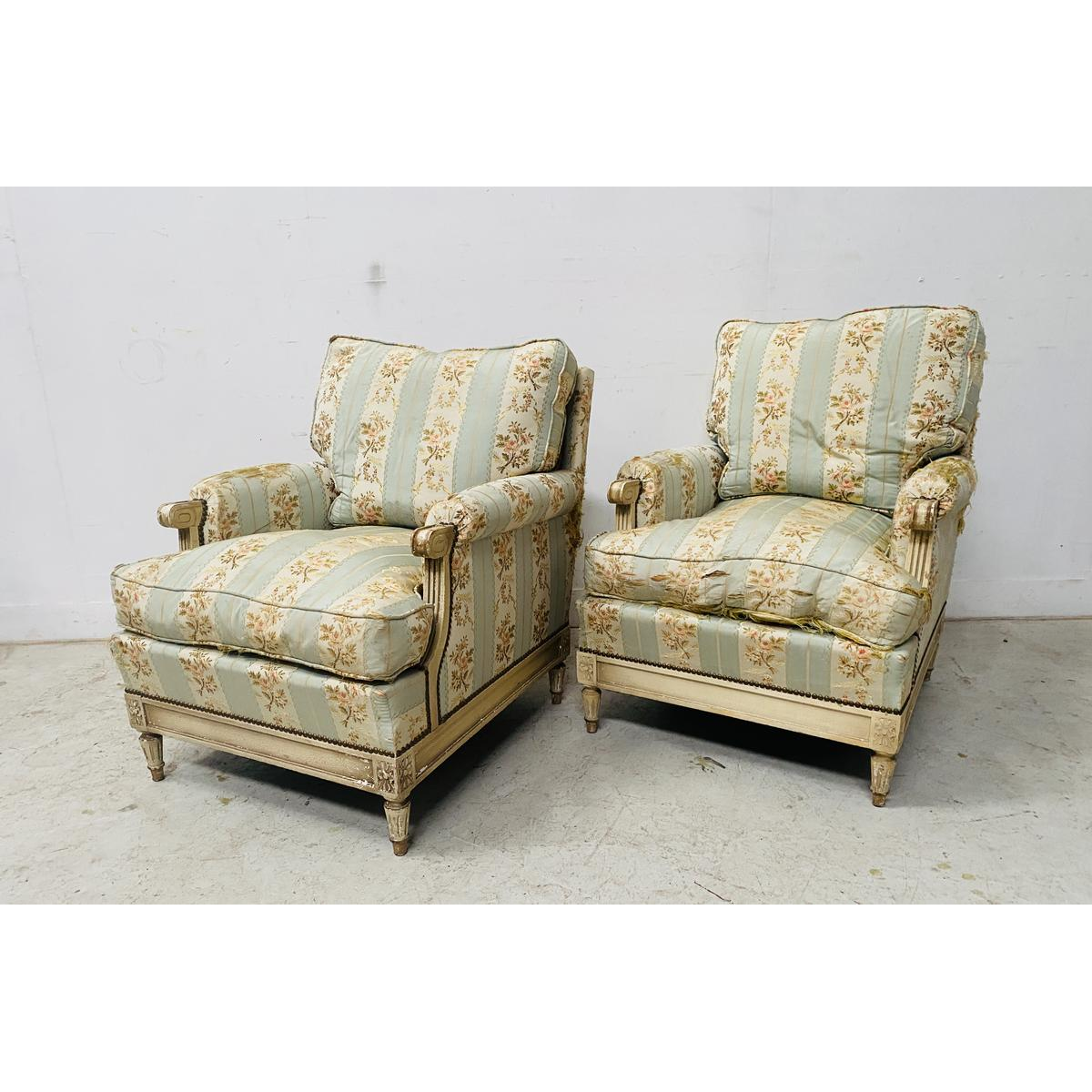 Een paar comfortabele fauteuils in Louis XVI-stijl, vervaardigd uit antiek gepatineerd beukenhout.