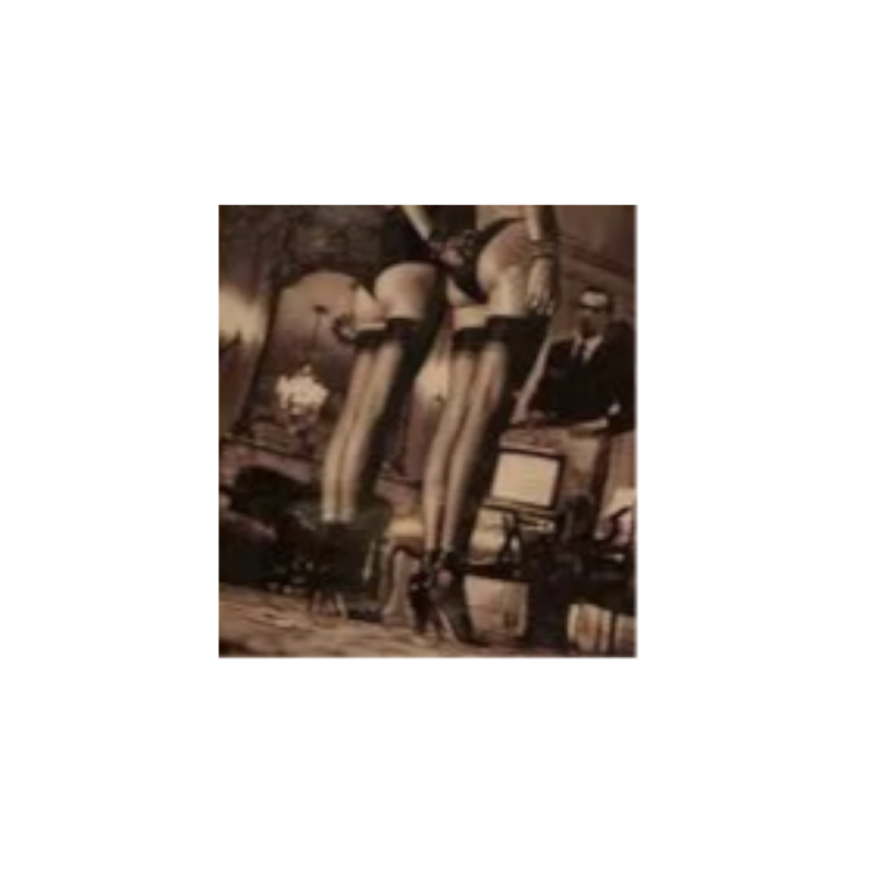 De scène, in zwart-wit, presenteert een zorgvuldig georkestreerde compositie: op de voorgrond de benen van een vrouw in haute couture kousen en duizelingwekkende hakken, in de typische pose van Newtons afbeeldingen – sensueel, dominant, sculpturaal. Haar achter haar rug gebonden handen versterken een dramatische spanning waarin controle, fetisjisme en gecodificeerde enscenering met elkaar verweven zijn. Op de achtergrond observeert een man in pak, met een bijna ceremoniële kalmte, de scène of neemt eraan deel, in een ingetogen sfeer met klassieke meubels en gedempte verlichting. Het geheel roept de burgerlijke interieurs op die Newton hergebruikte om een waar theater van macht, verlangen en ambiguïteit te creëren.