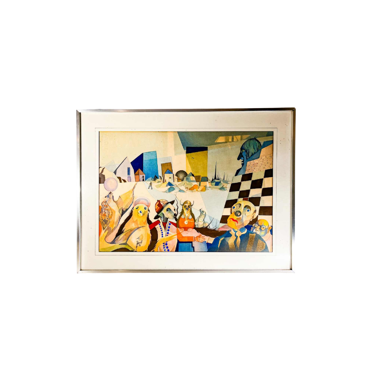 Kubo-surrealistisch schilderij, gemengde techniek op papier, gesigneerd en gedateerd “David 1974“