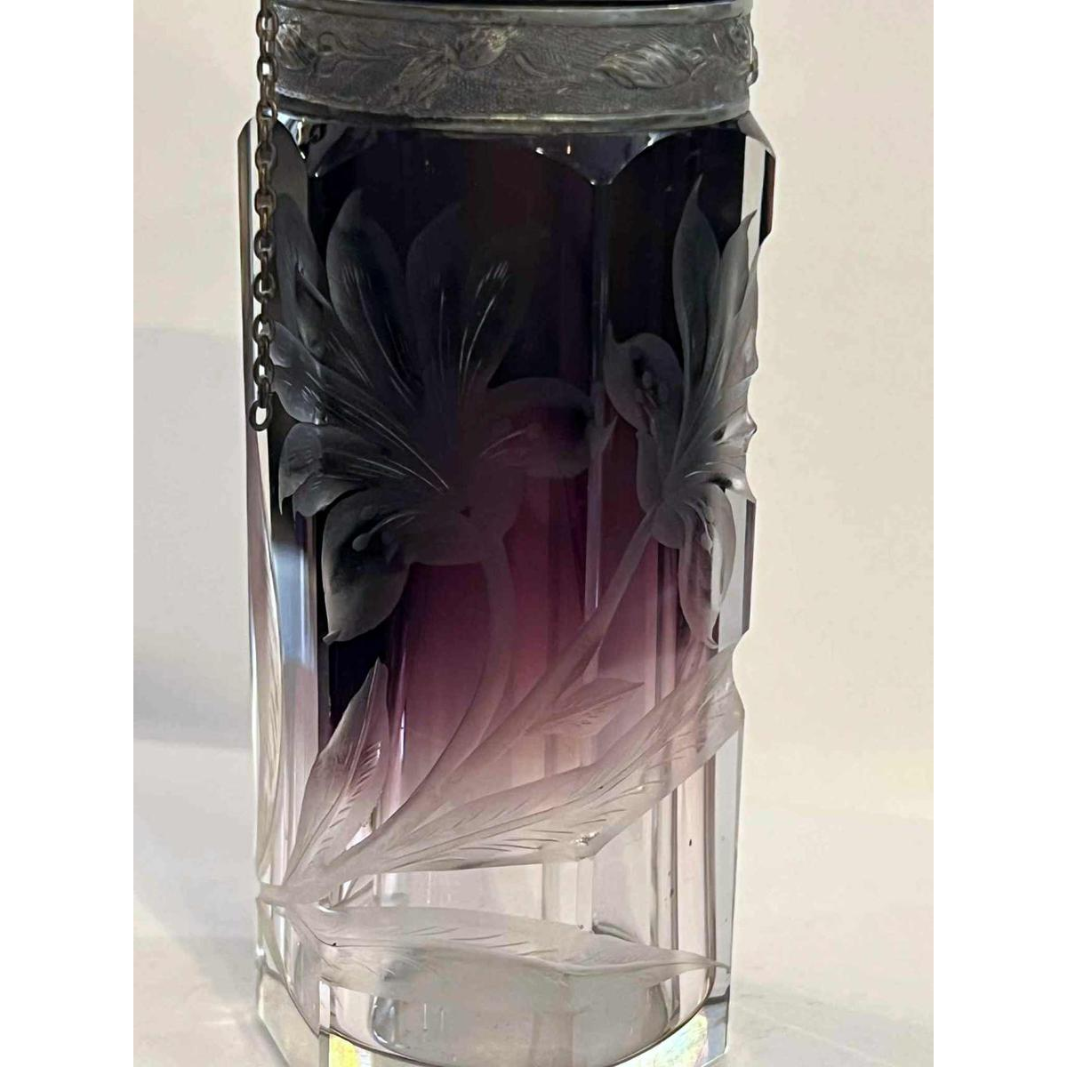 Travel parfumflesje van amethistkleurig geslepen kristal met irisdecoratie.