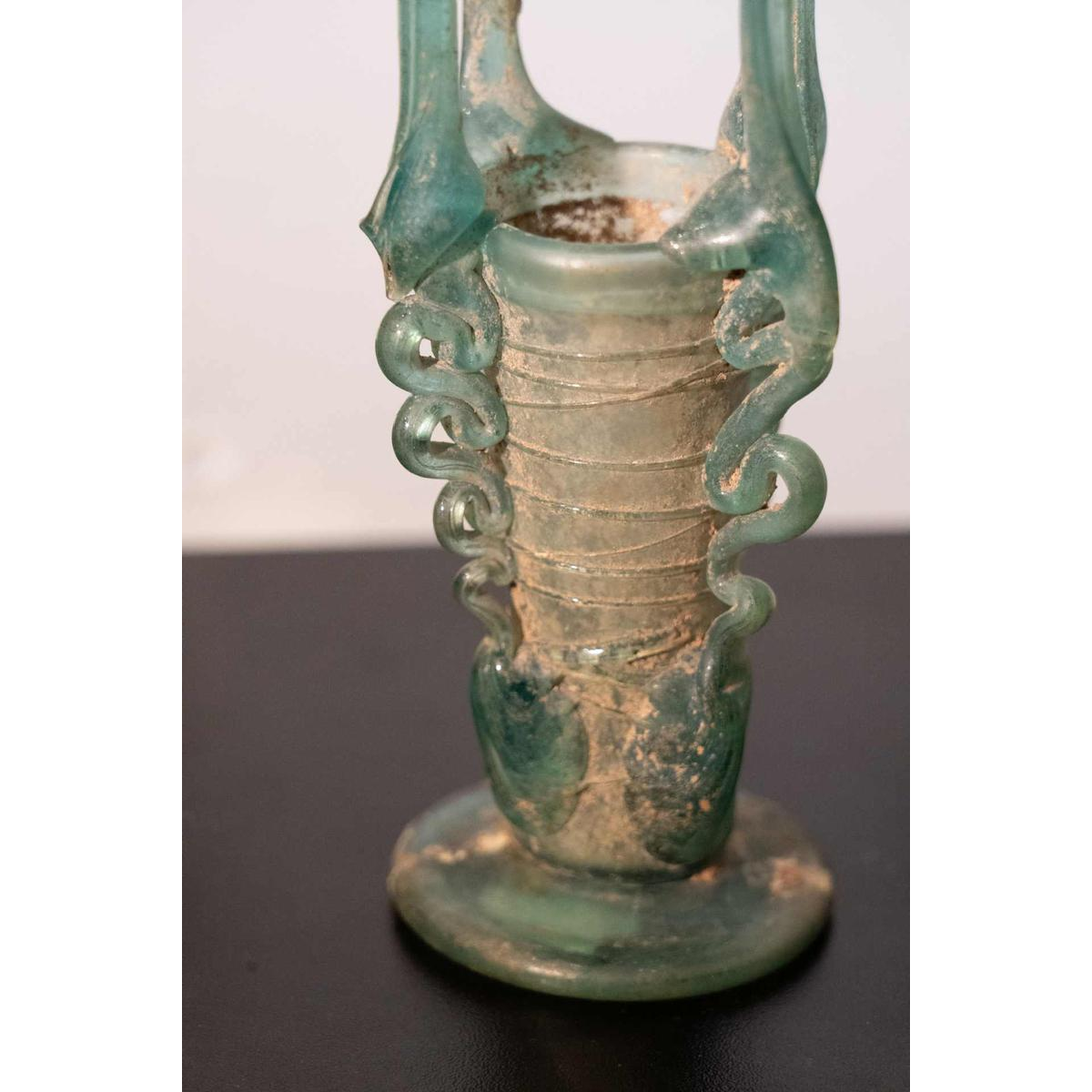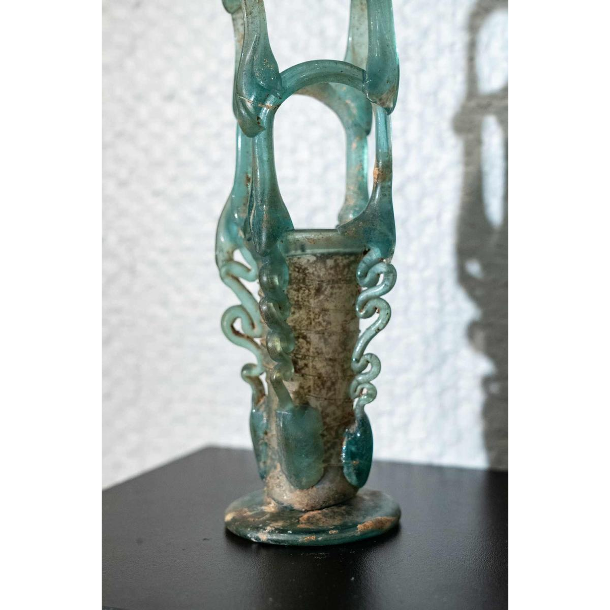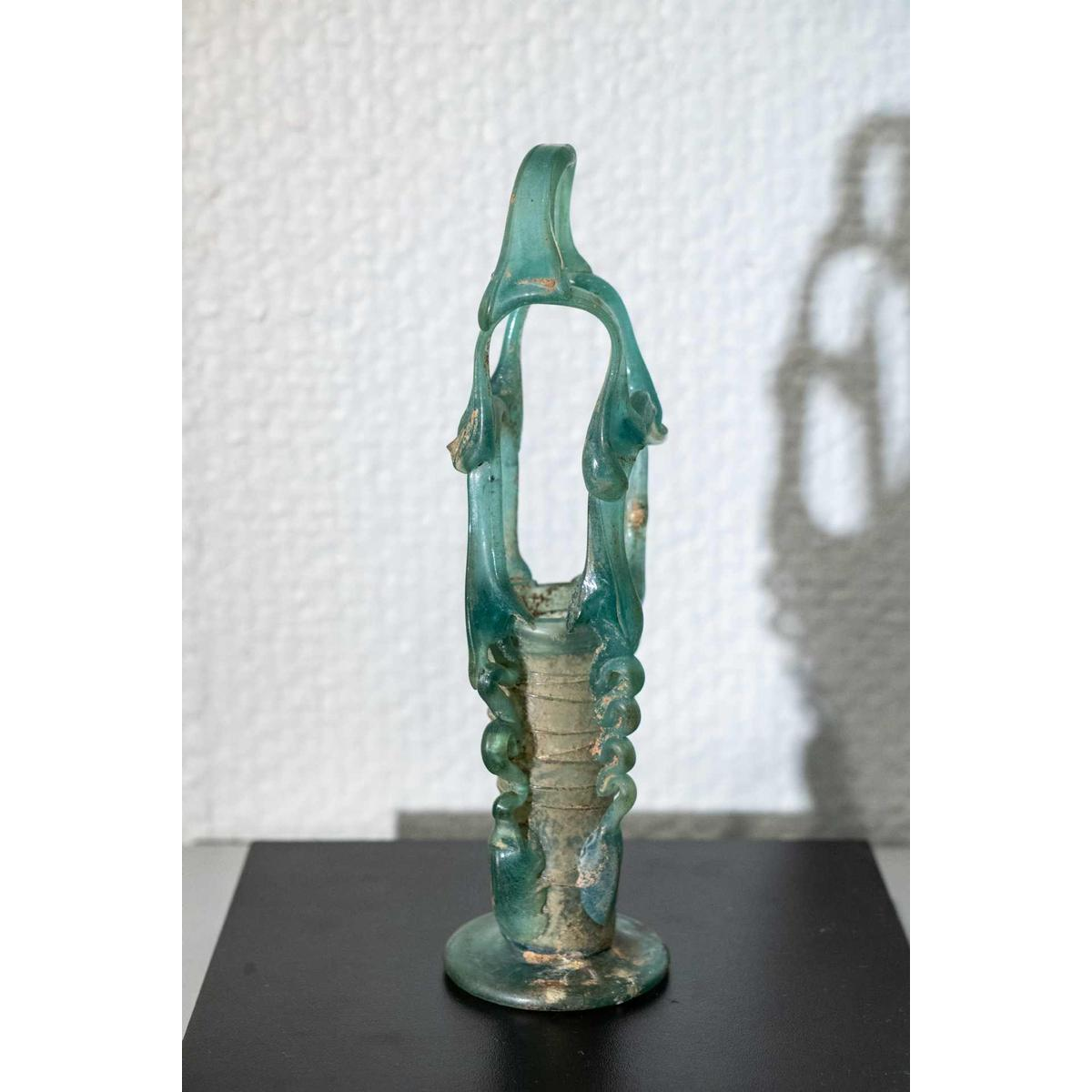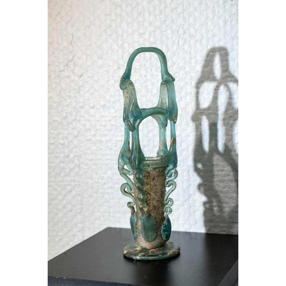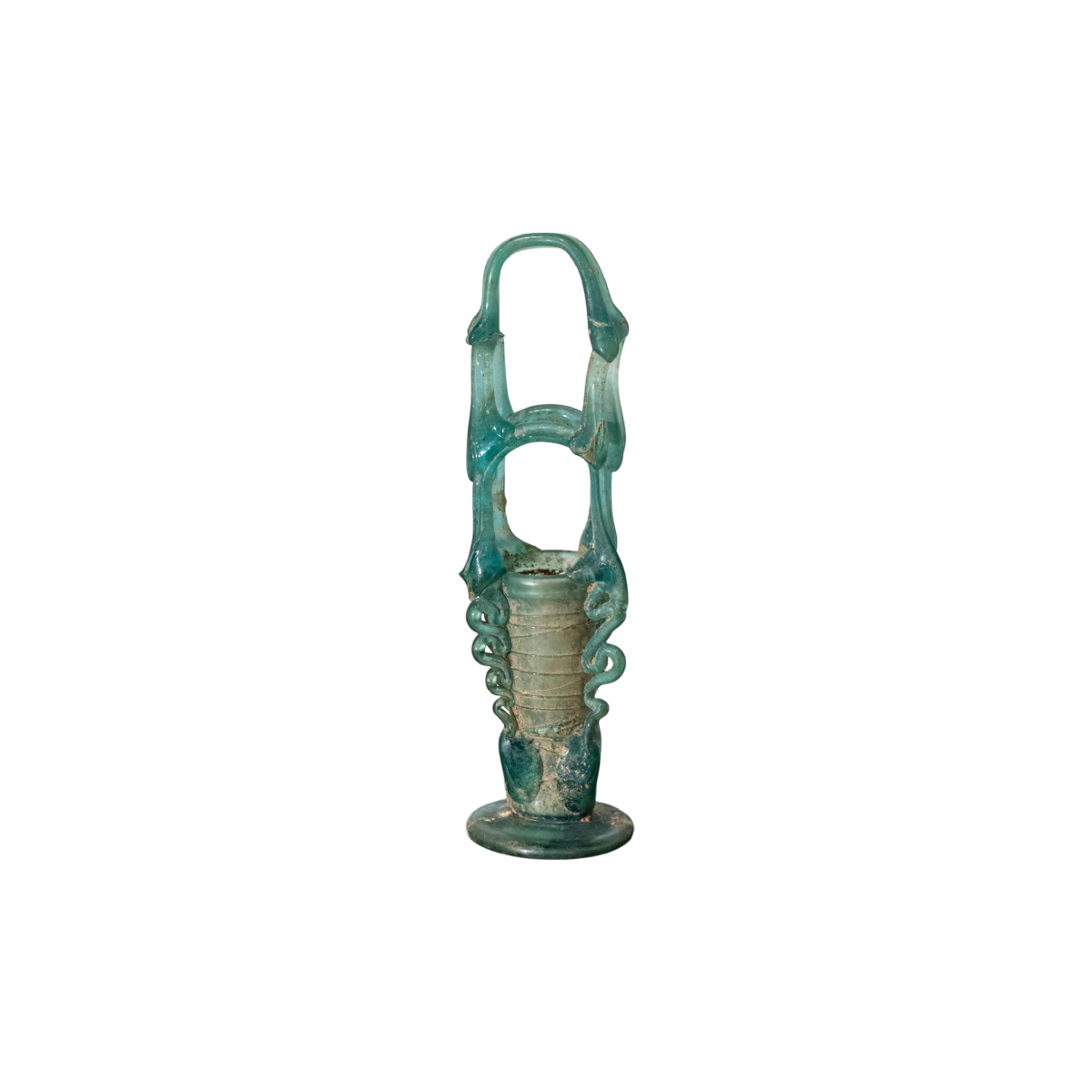 Dit opmerkelijke Romeinse glas, van fijn formaat en zeldzame elegantie, onderscheidt zich door zijn mandvorm, zorgvuldig geblazen en gevormd met behulp van de meest verfijnde glasblaastechnieken uit de late oudheid. Het heeft een handvat met twee niveaus en linten, typisch voor bepaalde luxeproducten uit de Late Periode. De romp van de vaas is rondom fijn geregen, waardoor een subtiele, ritmische reliëfversiering ontstaat die getuigt van de vaardigheden van de oude glasmakers. Vier decoratieve linten, gerangschikt langs een kardinale as - noord, zuid, oost en west - sieren het lichaam, waardoor het object een harmonieuze symmetrie en een bijna architecturale dimensie krijgt. Deze structuur suggereert misschien een rituele of symbolische functie, of gewoon een esthetische verfijning bedoeld om een gecultiveerde elite te behagen.