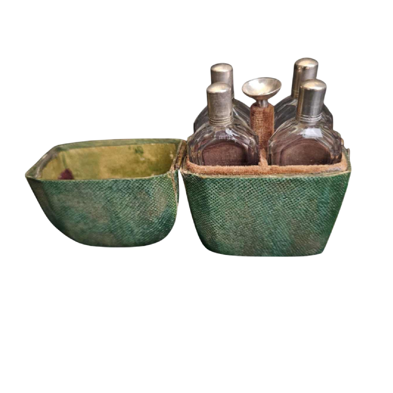 Parfumdoosje bekleed met rog met 4 +/- 6cm hoge kristallen parfumflesjes met kleine zilveren stoppers en mini glazen binnenstoppers. De set bevat een trechter om de flesjes te vullen. Een kleine drukknop opent het doosje. Gemaakt in Frankrijk aan het einde van de 18e eeuw.