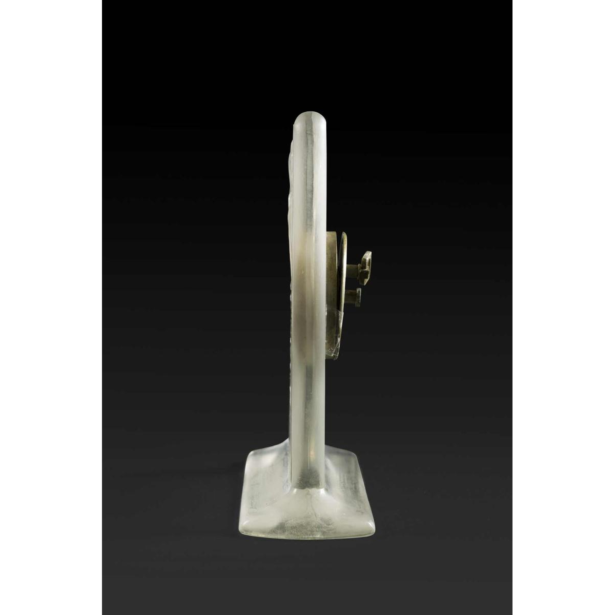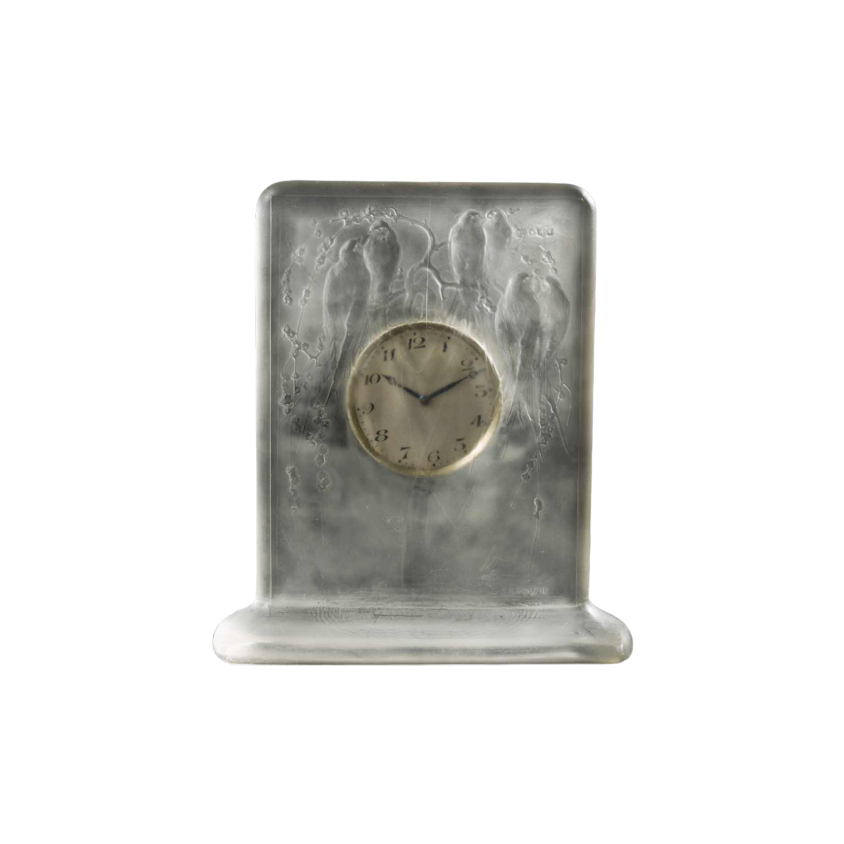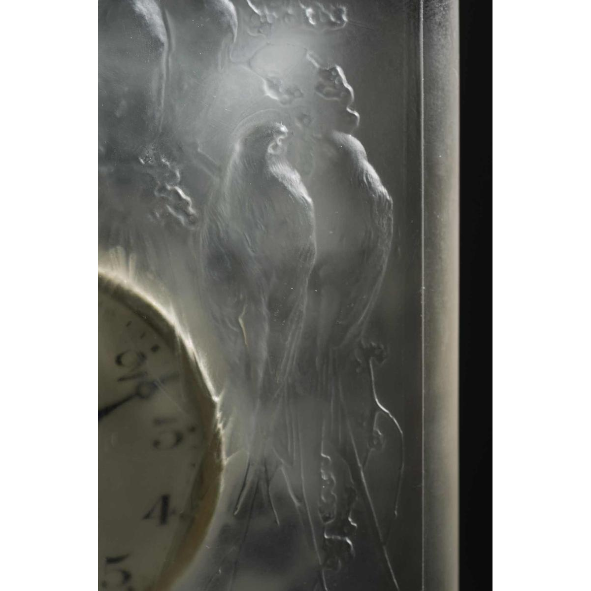 « QUATRE PERRUCHES » is een Art Deco glazen pendulette van RENE LALIQUE (1860-1945). In reliëf gegoten met zes parkieten op boomtakken in een bosrijke omgeving. Zwitsers uurwerk 'HENRI DISTEHEIM' (aangegeven op de achterkant van de wijzerplaat) met een duur van acht dage . Handtekening: 'R Lalique' in reliëf op de voorkant, gegraveerd op de onderste rand. Afmetingen: - H: 13,50 cm; - B: 12,50 cm (met sokkel); - D: +/- 1 cm; Model gemaakt in 1920 van opalescent gegoten-geperst glas met een satijnen patina. Referentie: « R. LALIQUE, CATALOGUE RAISONNE DE L'ŒUVRE DE VERRE », FELIX MARCILHAC, Les Editions de L'Amateur, 2011, pagina : 376, N° 760.