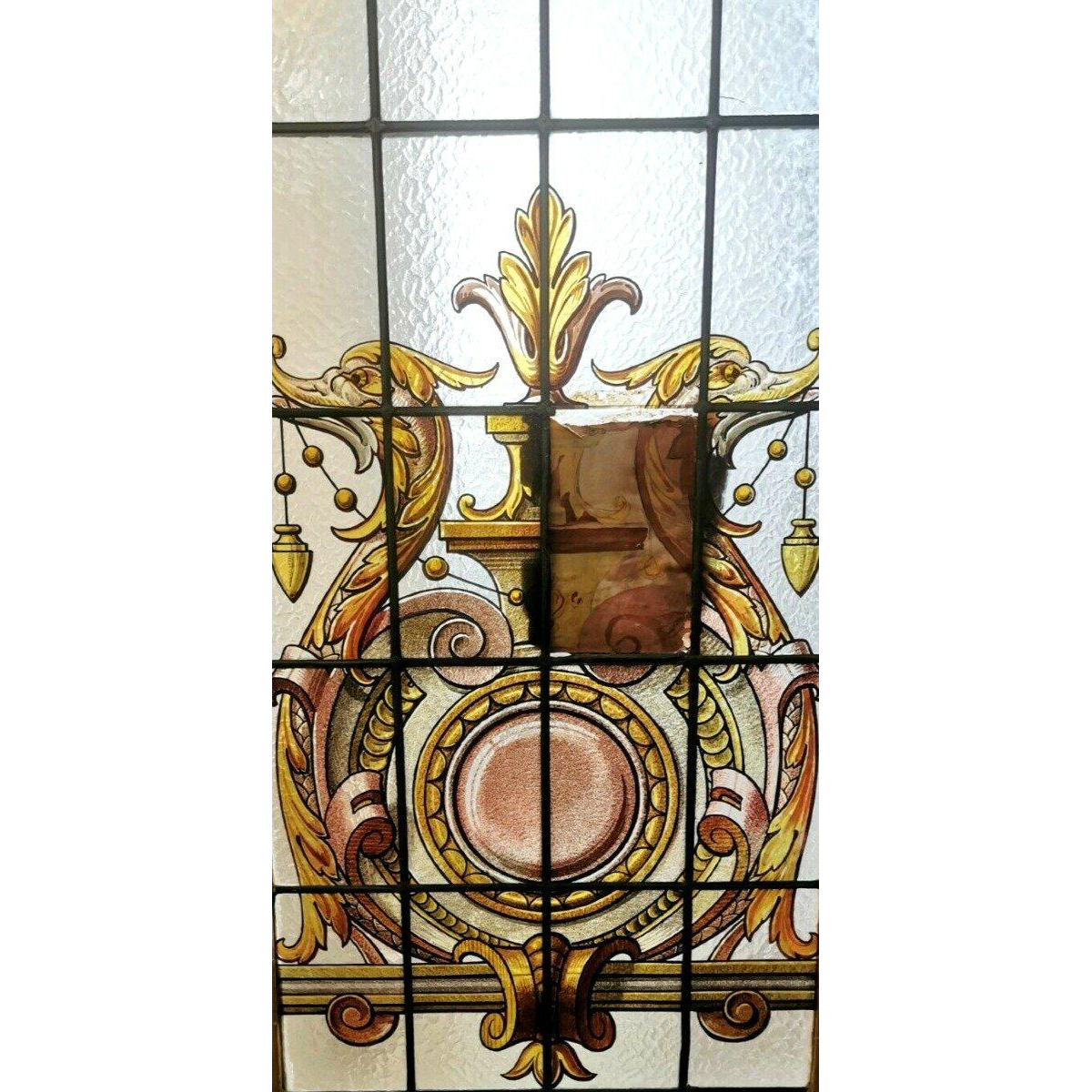 De deur vertoont gebruikssporen en er ontbreekt een stuk beschilderd glas in het midden.