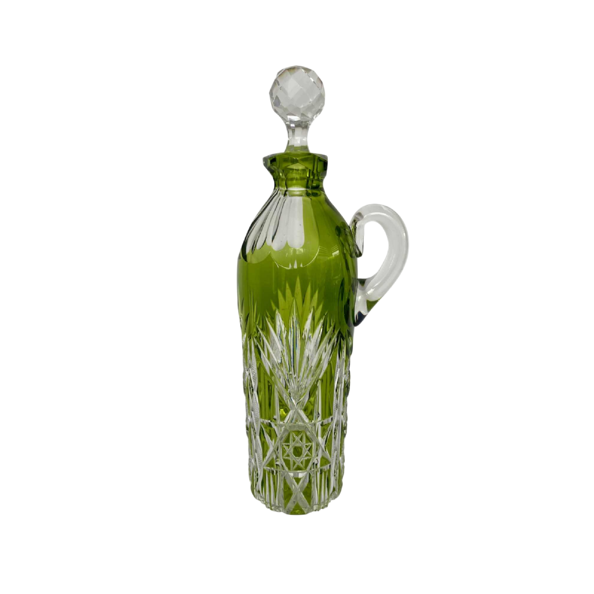 Val-Saint-Lambert, karaf/likeurkan van geslepen kristal met groene voering, begin 20e eeuw