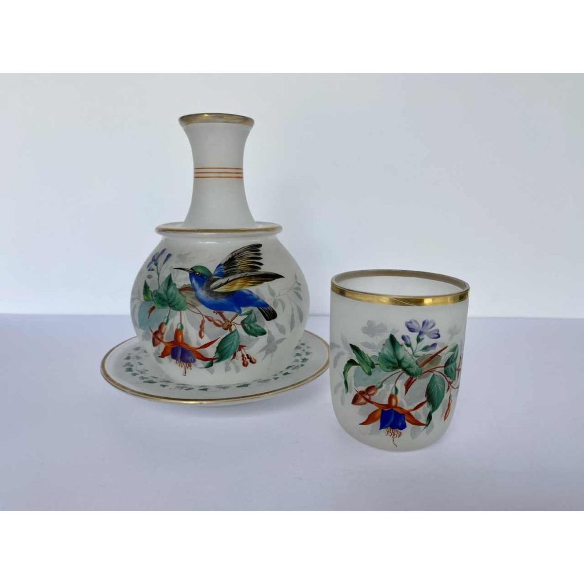 Nachtservies uit de kristalfabriek van Baccarat, bestaande uit 3 stukken: de karaf, het glas en de schotel. De karaf is voorzien van een schildering van een kolibrie in fuschia's. Het bloemmotief wordt herhaald op het glas en een bladmotief op de schotel. Op de achterkant is een varenmotief geschilderd. Het verguldsel is een beetje beschadigd. Er zit een draadje roest aan de onderkant van de schotel.