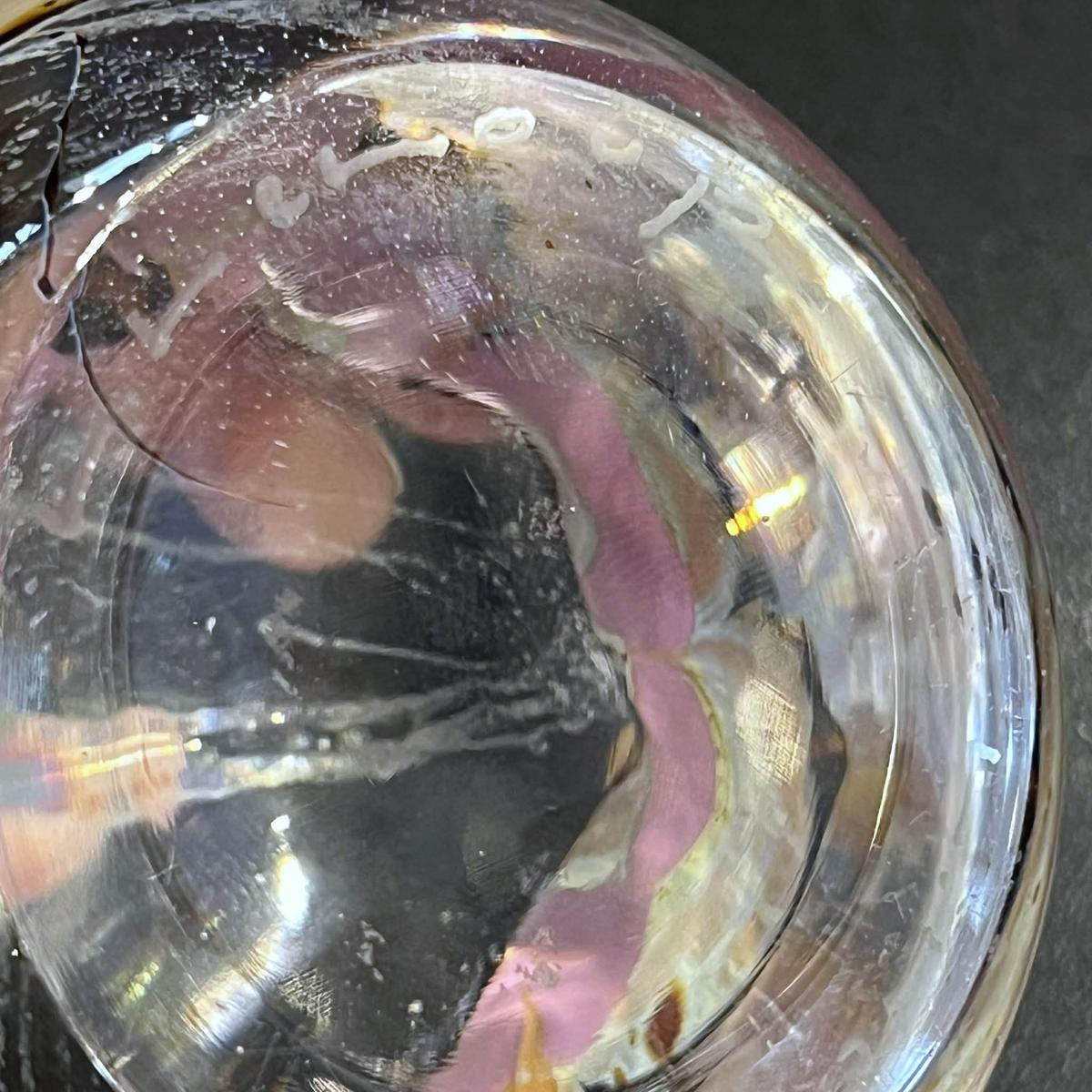 Versierd met metaaloxiden in tinten roze-oranje op een transparante achtergrond.