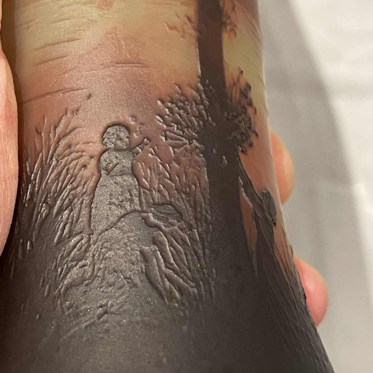 Een meerlagige kristallen vaas met zuurgeëtst decor van een geanimeerd landschap. De vaas draagt de signatuur D'Argental en het monogram SL voor Saint Louis.