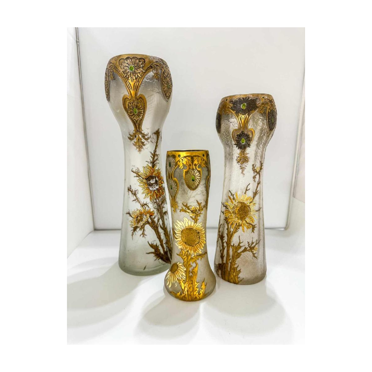 Set van 3 Legras vazen in 3 verschillende maten (41, 34 en 25cm hoog) met distelbloemmotieven in Art Nouveau stijl; zuurgeëtste decoratie met gouden accenten en gekleurd email (groen) op de hals; samen verkocht.