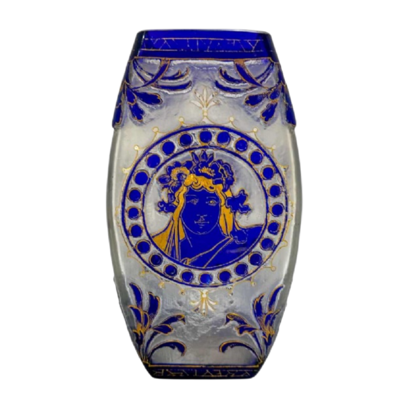Ludwig Moser Art Nouveau vaas uit 1890-1900, met een prachtig vrouwelijk motief in de stijl van Alphonse Mucha; mooie blauwe en gouden kleuren; plantendecoratie op de andere drie zijden van de vaas.