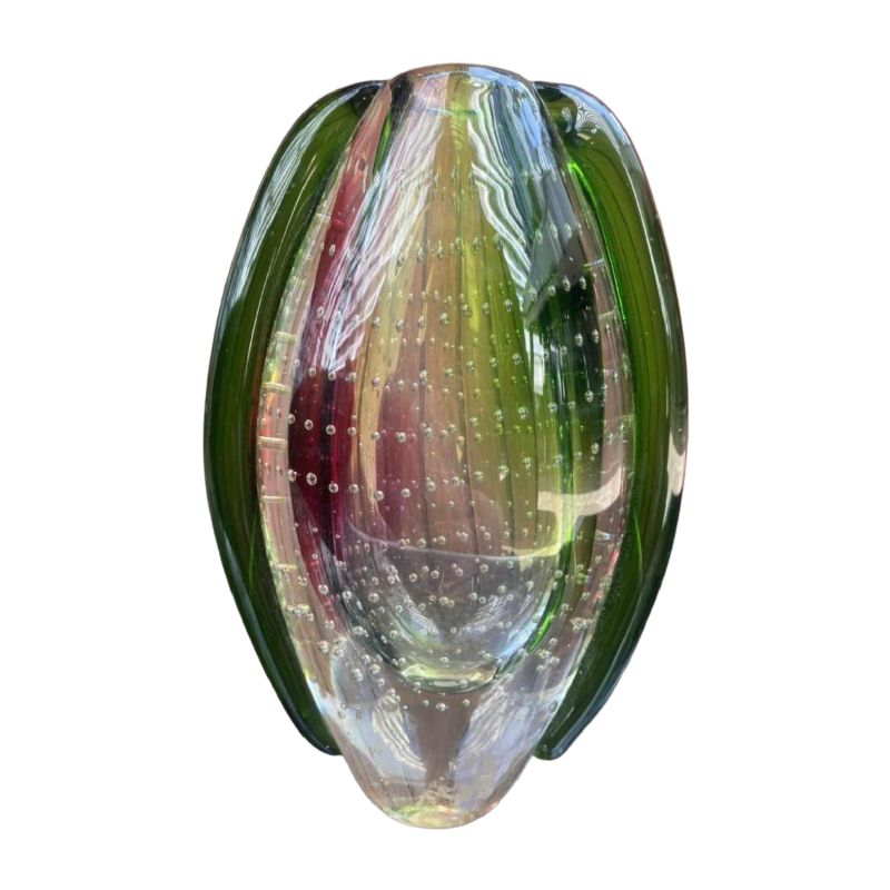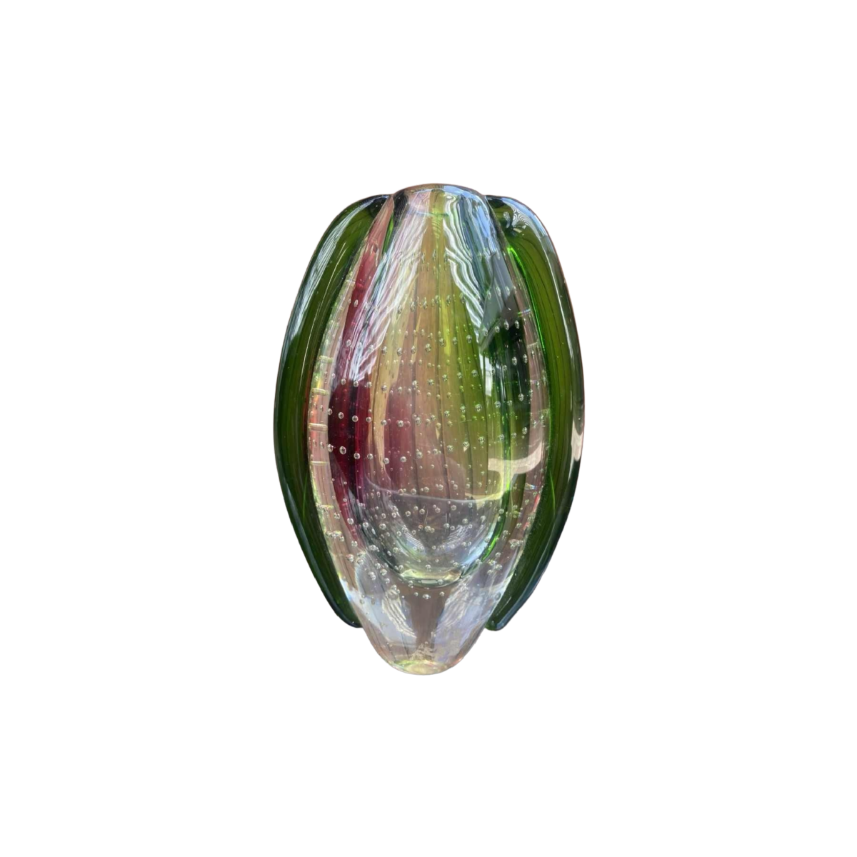 Rosenthal 1970 glazen vaas getiteld Dew Drop groen, rood en transparant