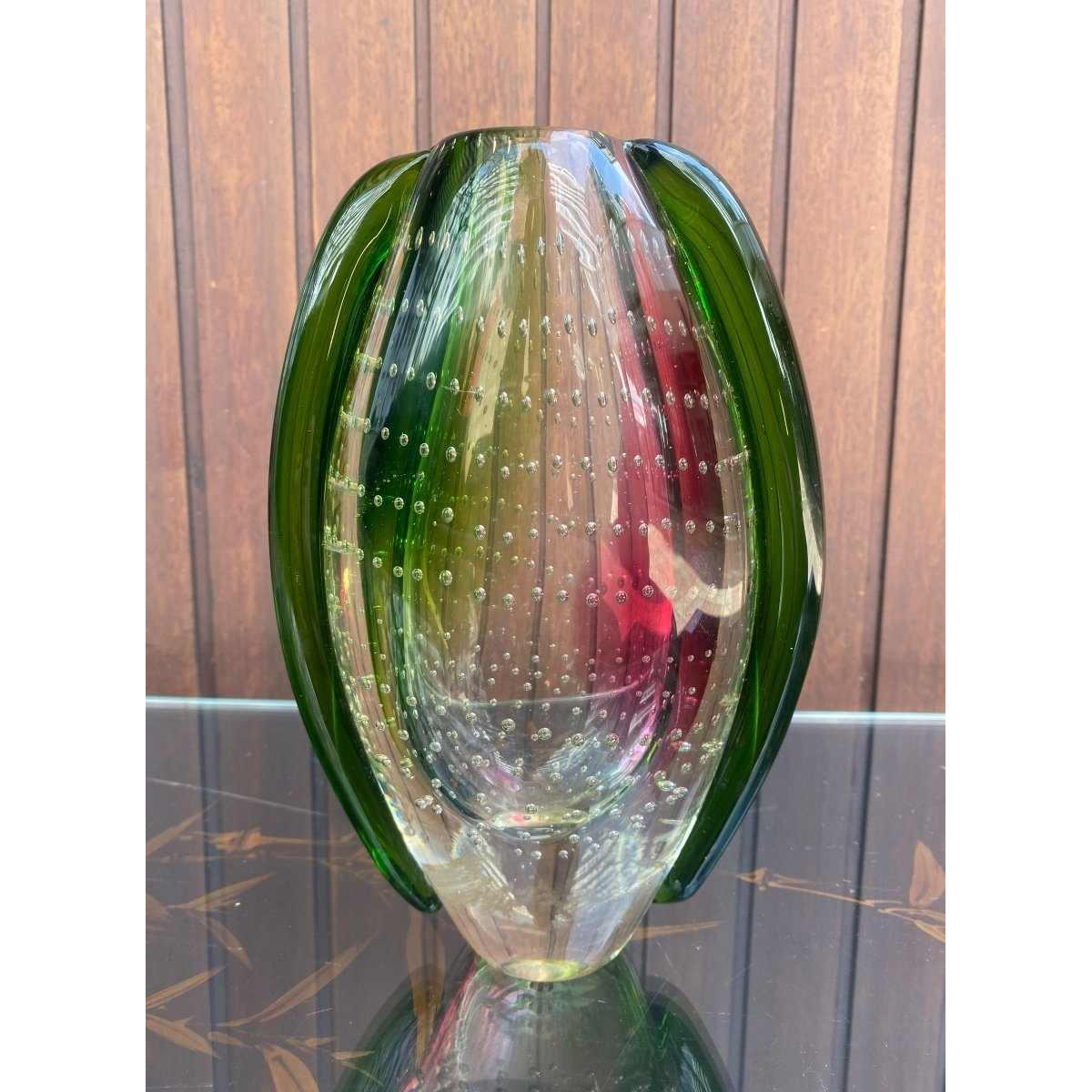“Vaas in glas gesigneerd Rosenthal 1970 getiteld Dew Drop kleur groen rood en transparant”.