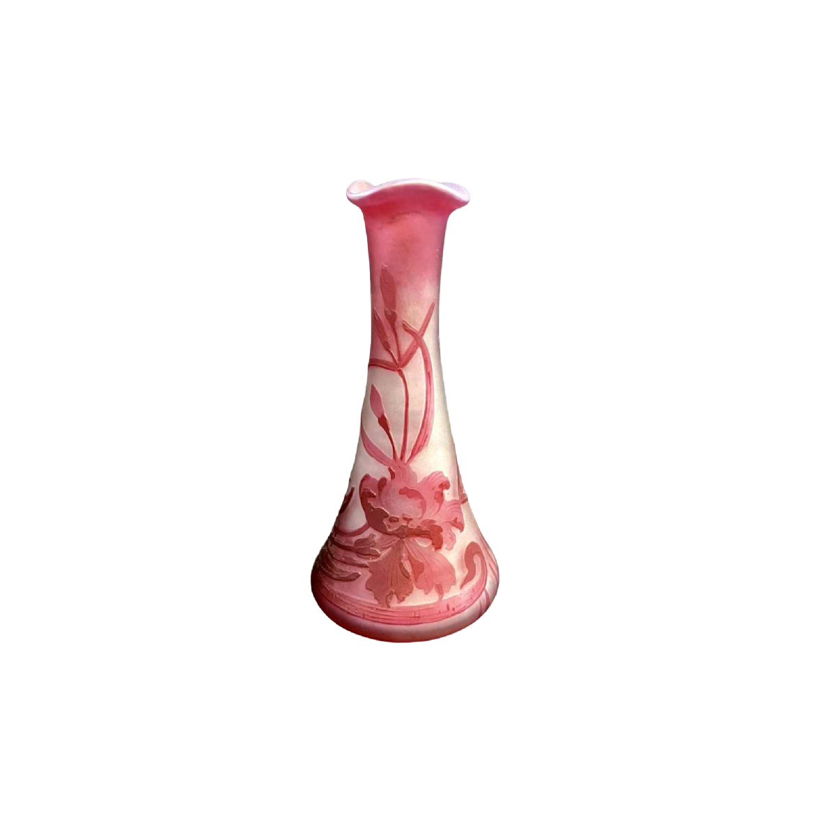 VAL SAINT LAMBERT Art-Nouveau vaas van rood gelinieerd glas met zuurgeëtst bloemmotief.