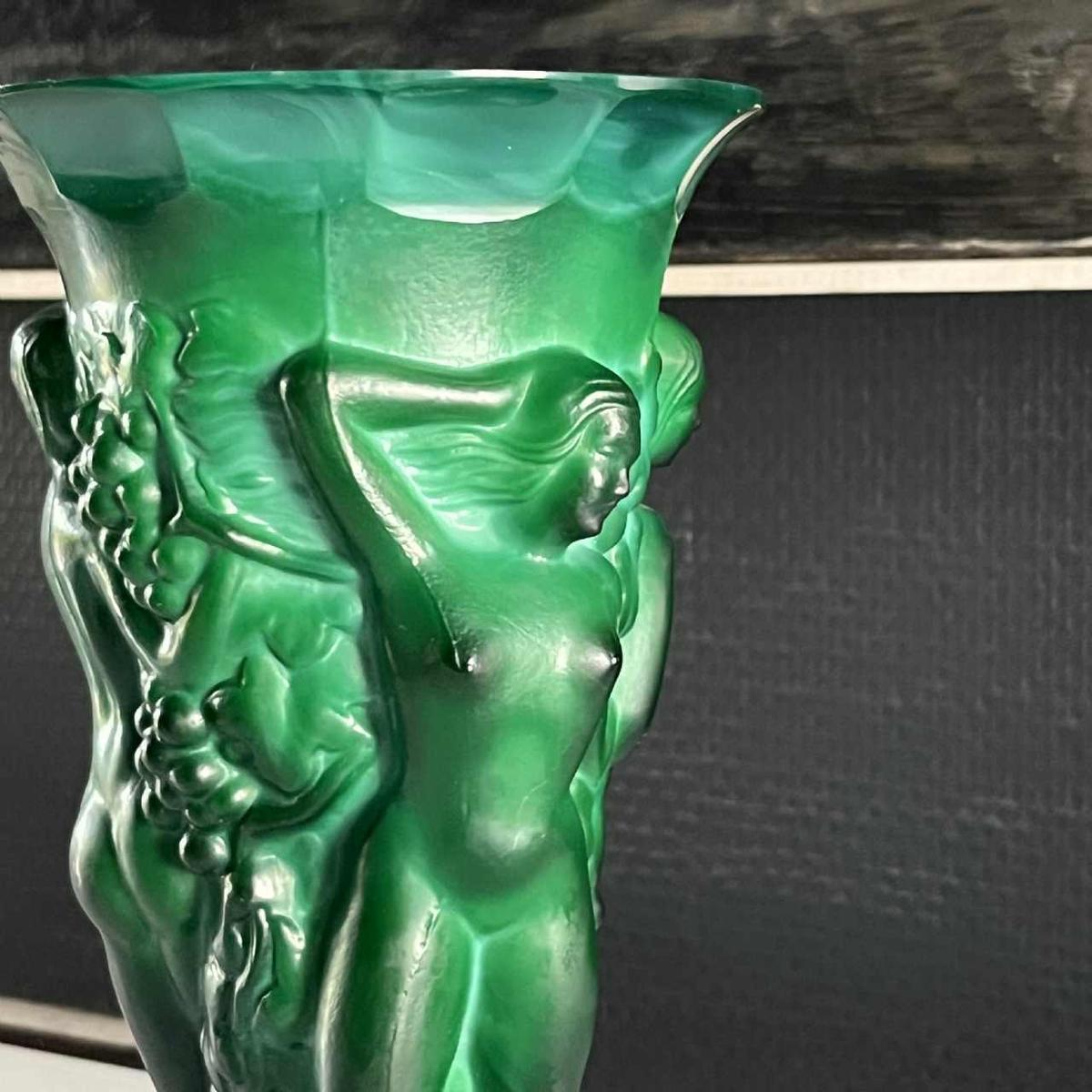 This form is only used to notify us of illegal content on product: Heinrich Hoffmann (attr) Art Deco vaas met bacchanten "Ingrid" serie jade kristal / malachiet groen, ca 1933.