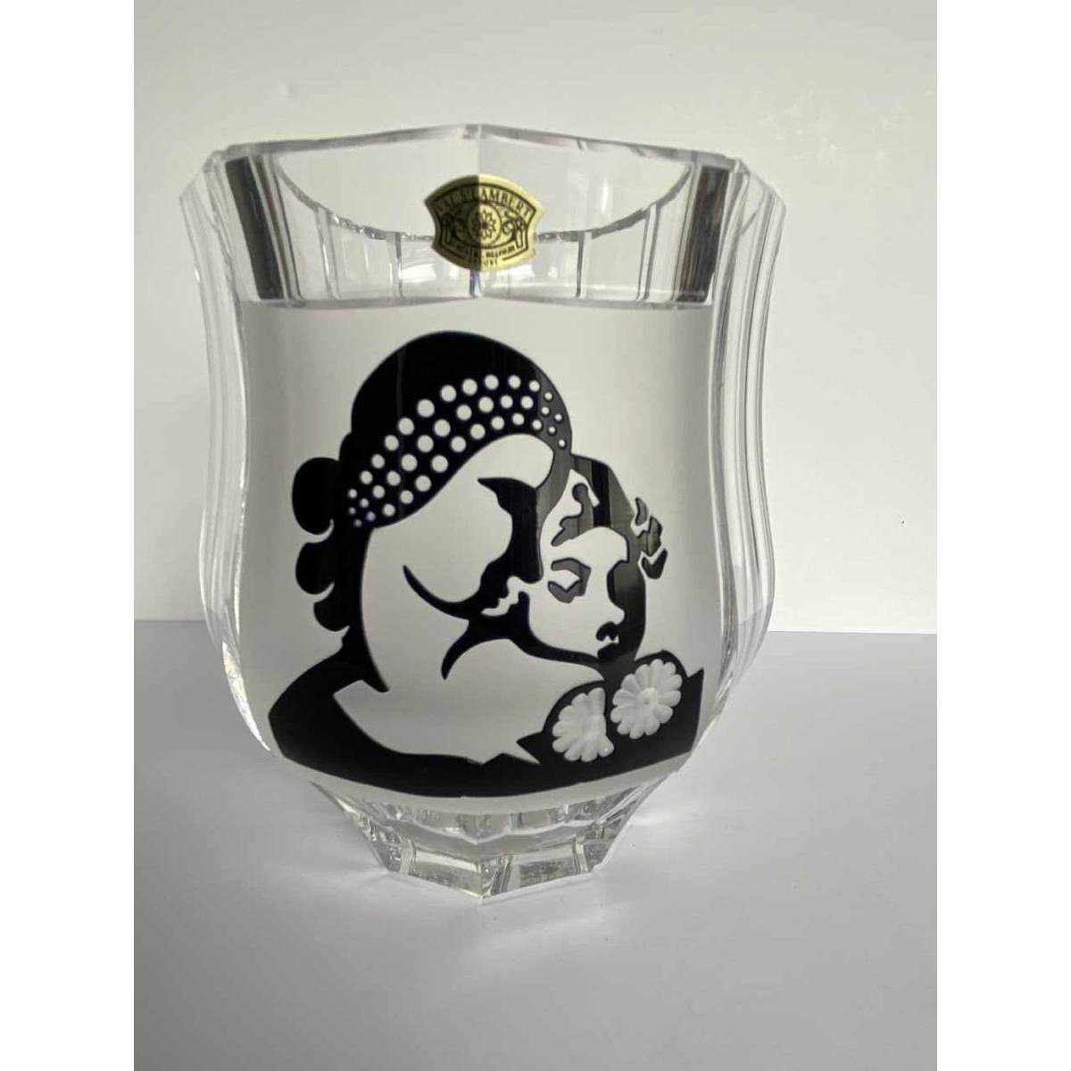 Het betreft een kleurloze, gefacetteerde, zwart omrande kristallen vaas, waarvan het ontwerp twee vrouwengezichten voorstelt.