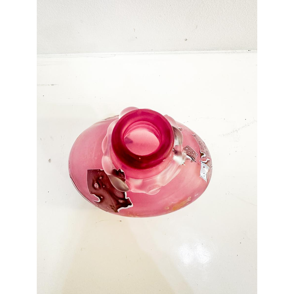 Klein vaasje van Louis Leloup in roze tinten met abstracte patronen, gesigneerd onder het stuk.