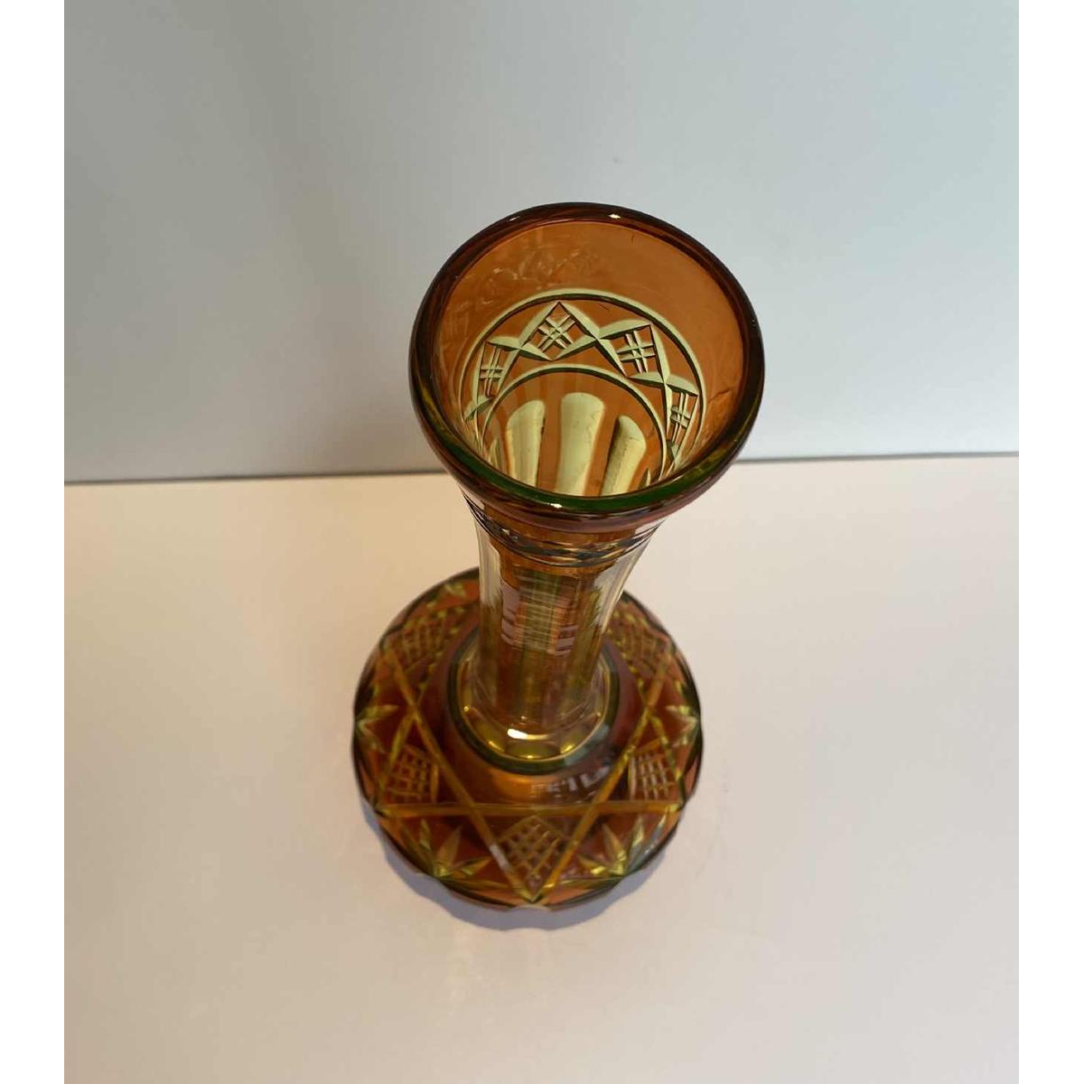 Val Saint Lambert, vaas met lange hals in geslepen uraan kristal met oranje voering