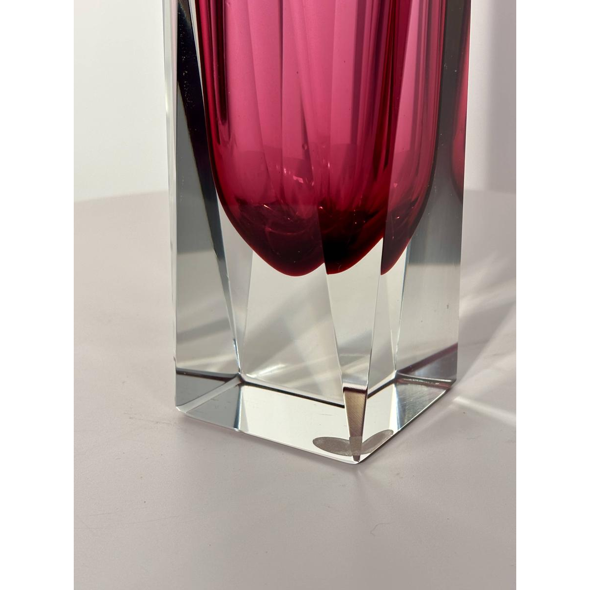 Techniek: Sommerso-werk (gelaagd glas) met een fuchsia amarantkleurige kern, ingebed in een dikke massa doorschijnend kristal.