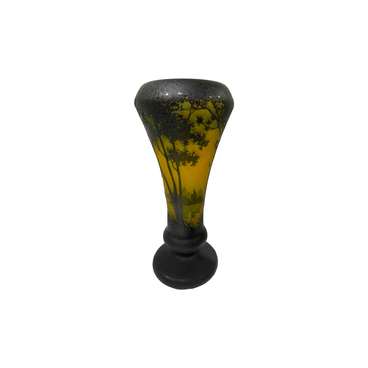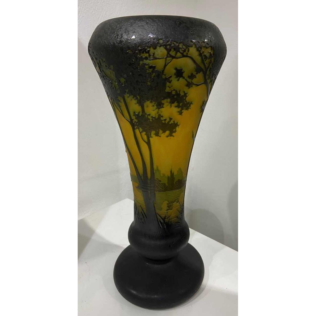 Een prachtige vaas van zuurgeëtst meerlaags glas, gedecoreerd met een landschap aan een meer met hoge bomen. Achter de bomen in de schaduw creëren het meer met zijn weerspiegelingen en de ondergaande zon een landschap van grote transparantie.