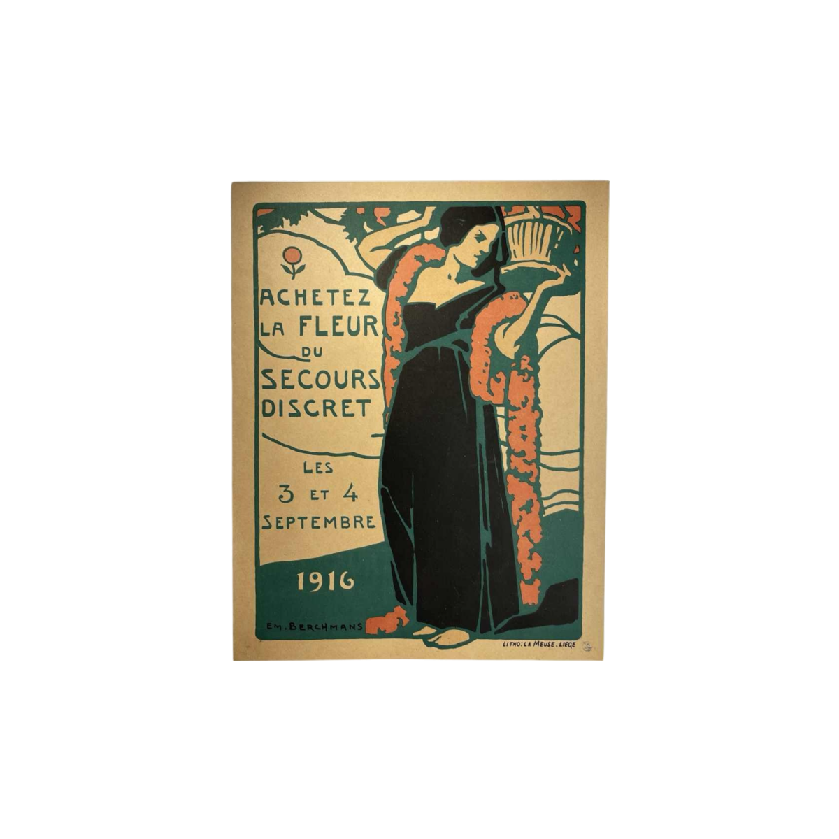 De art-nouveaucompositie toont een gedrapeerde vrouwenfiguur met een mand bloemen, een symbool van solidariteit, vergezeld van een tekst die oproept tot de aankoop van de “Bloem van de Discrete Hulp“, een liefdadigheidsverkoop die plaatsvond op 3 en 4 september 1916.