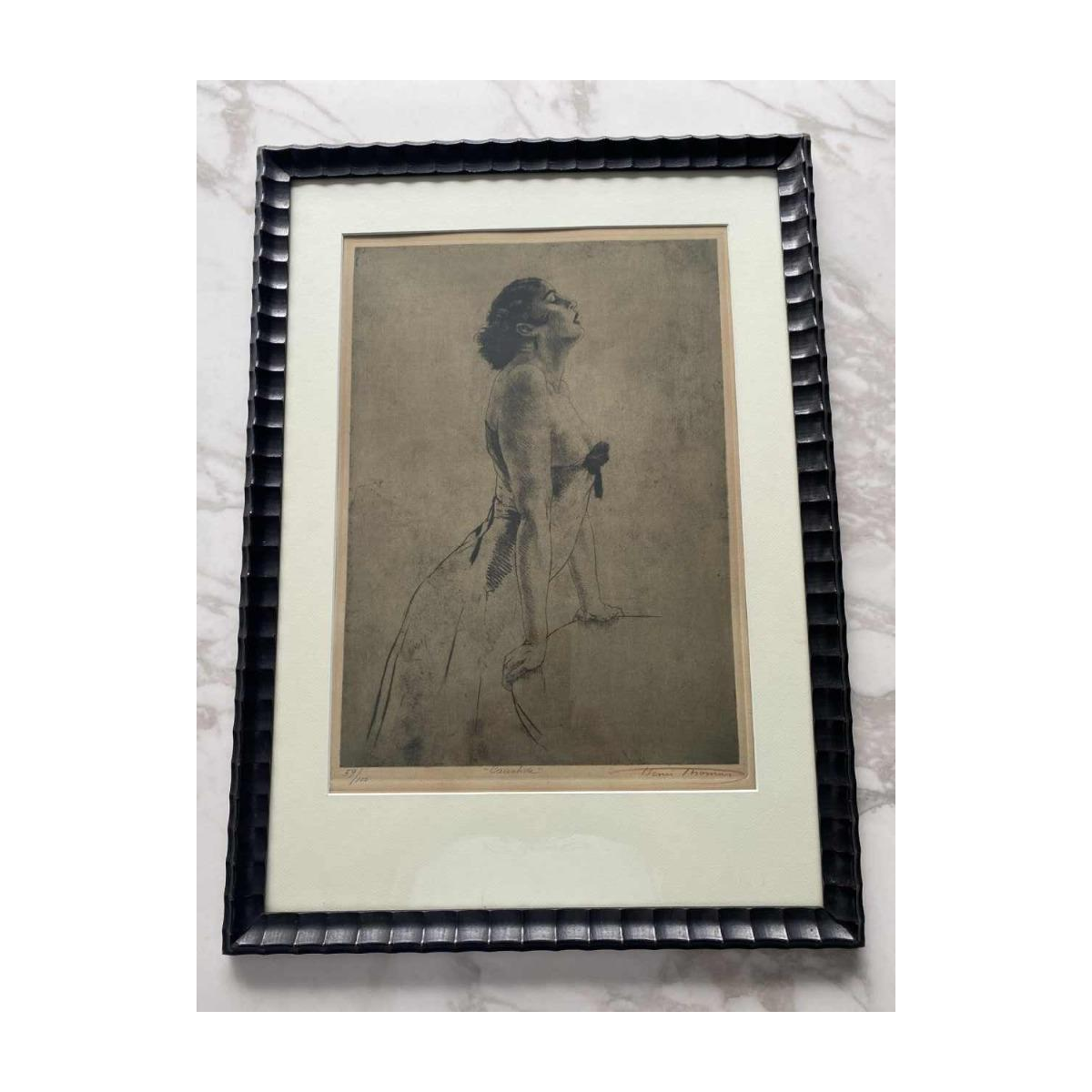 Zeer mooie litho van Henri Thomas met een vrouw in profiel, in een lange jurk, haar rug gebogen en haar handen op een tafel. Ets naar een houtskooltekening.