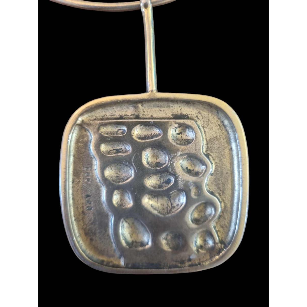 Halsketting van ontwerper Miguel Berrocal in brons en staal met de afbeelding van de torso van David. De diameter van de hals is 13 cm en de hanger is 6 cm bij 6 cm.