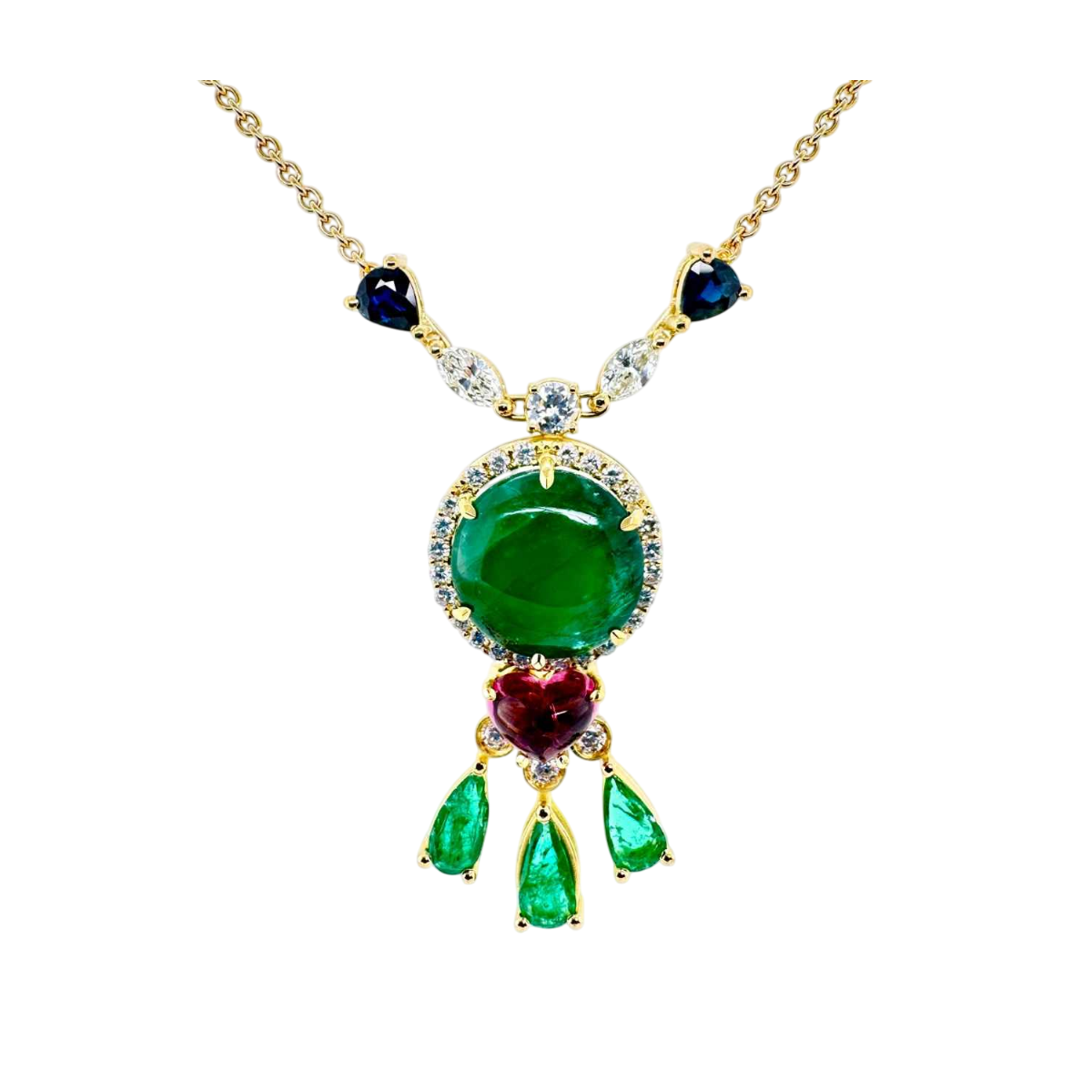 18 karaat geelgoud, diamanten, cabochon smaragd & edelstenen hanger