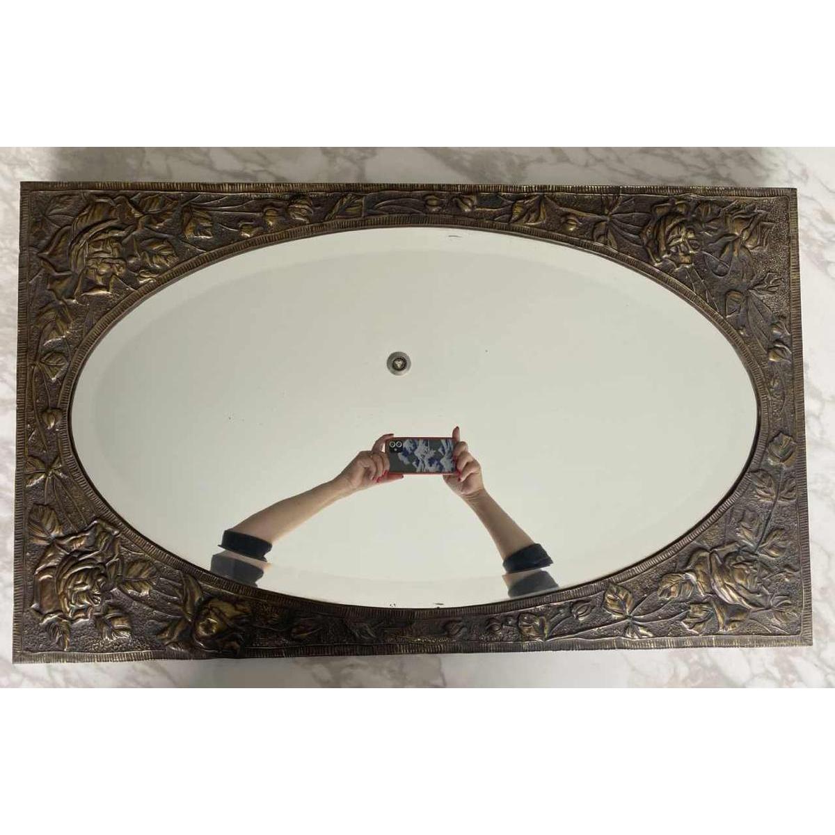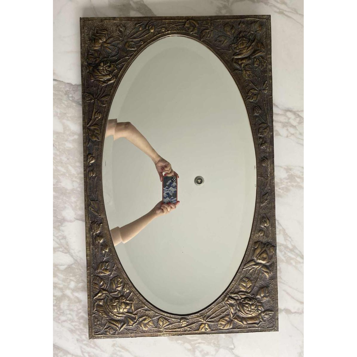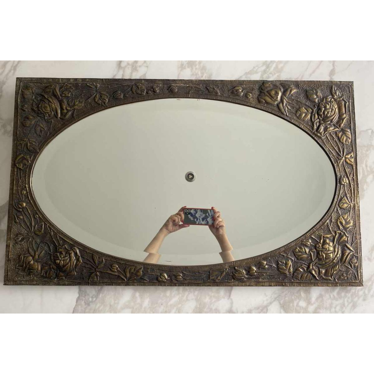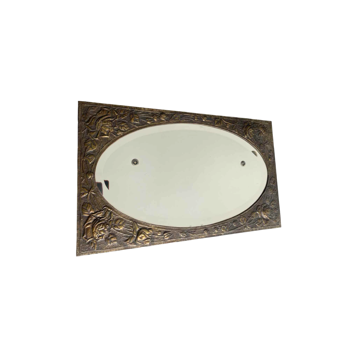 Grote ovale spiegel, bisauté, gevat in een rechthoekige lijst van repoussé messing, versierd met rozen rondom.