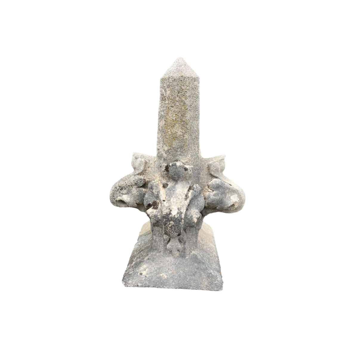 De vierkante basis is bekroond met drie acanthusbladeren die uitgroeien tot een prachtige achthoekige obelisk eindigend in een punt.