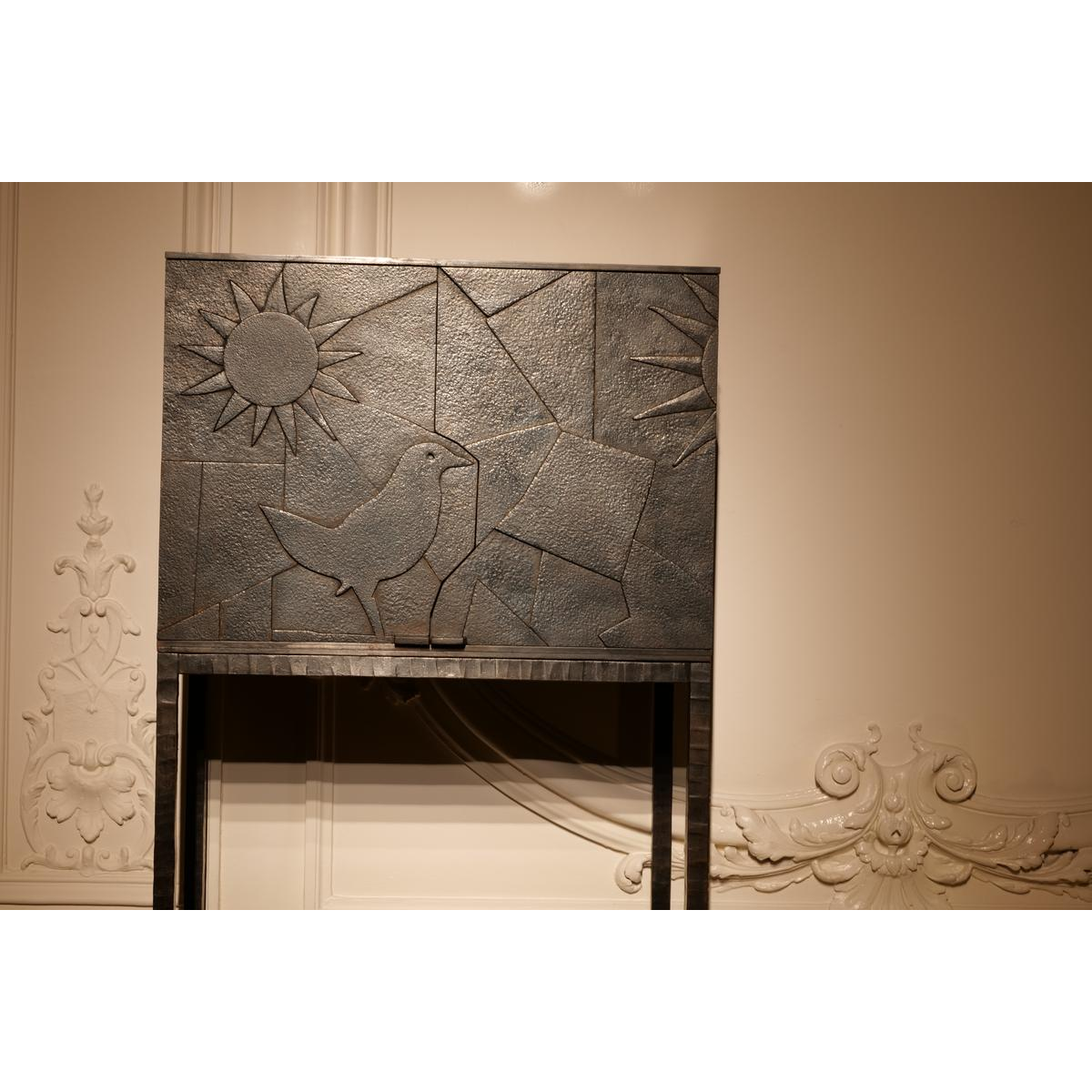Het meubelstuk, volledig vervaardigd uit gehamerd smeedijzer, onderscheidt zich door zijn slanke lijnen en zijn uiterst minimalistische, bijna etherische voet, waardoor de kast lijkt te zweven. De voet is voorzien van een bas-reliëf, opgebouwd uit vlakke, mozaïekachtige metalen oppervlakken, waarin twee emblematische motieven uit het universum van de kunstenaar voorkomen: een gestileerde, stralende zon en een zittende vogel, gereduceerd tot zijn essentiële contouren – een figuur die zowel primitief als symbolisch is. Het gepatineerde zwarte oppervlak, met zijn subtiele nuances, versterkt het ruwe, minerale, bijna architectonische effect van het stuk. De balans tussen de strengheid van de structuur en de poëzie van het bas-reliëf creëert een stuk dat tegelijkertijd grafisch, totemachtig en diep eigentijds is. De binnenkant is voorzien van een plank, die discrete en functionele opbergruimte biedt zonder de algehele puurheid te verstoren. Haut Perché belichaamt perfect Germaine's kenmerkende stijl: meubelsculptuur.
