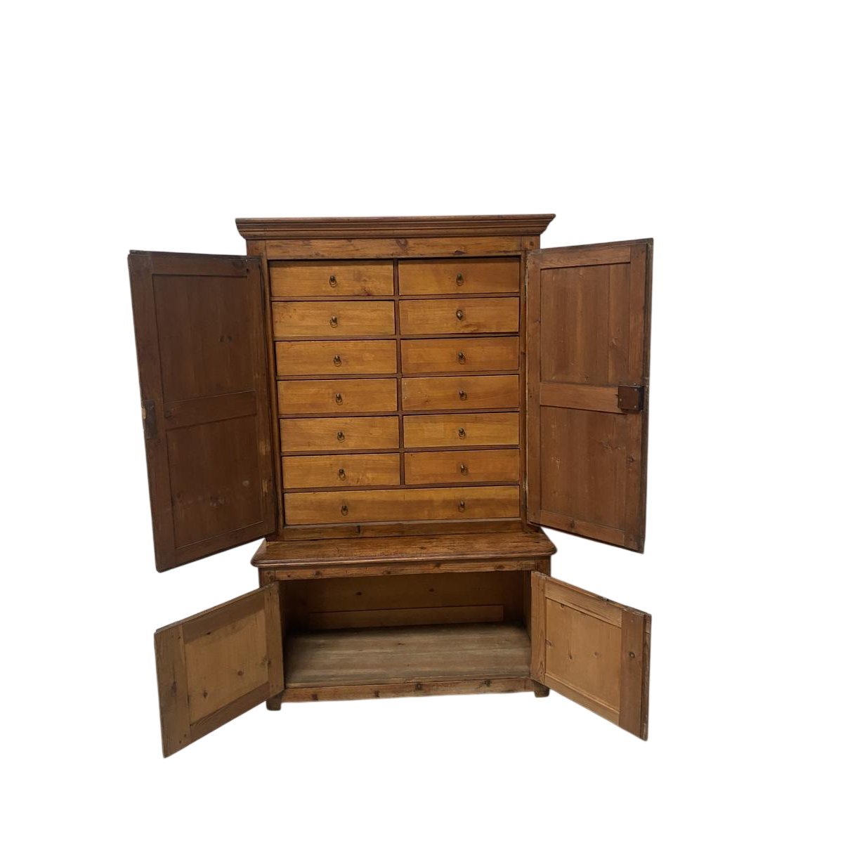 Tweedelig administratief archiefkastje, massief vurenhout, 20e eeuw