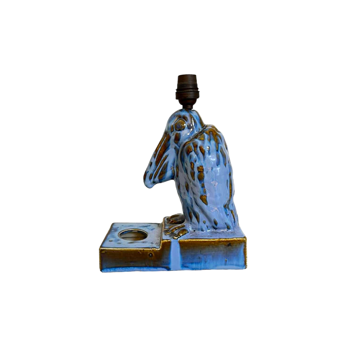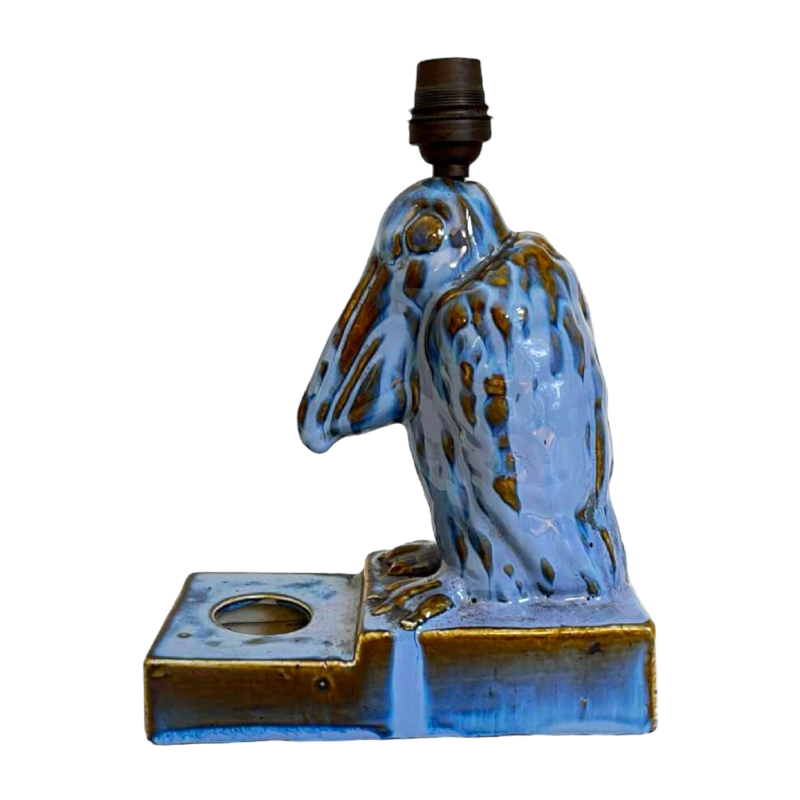 Deze bureau- of tafellamp, een combinatie van lamp, beeldhouwwerk en inktpot, heeft een typisch dierenthema uit die periode en is uitzonderlijk goed gemaakt in briljant blauw geglazuurd steengoed.