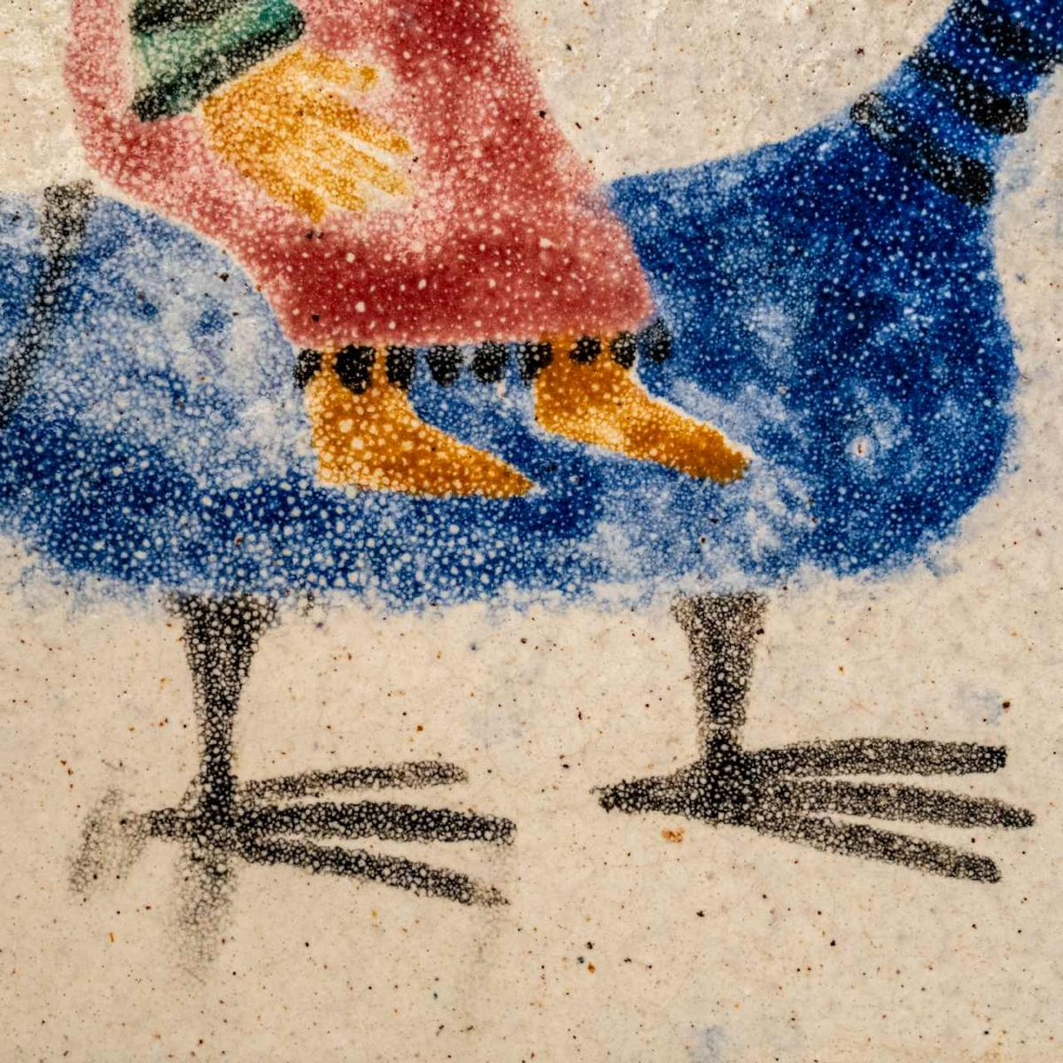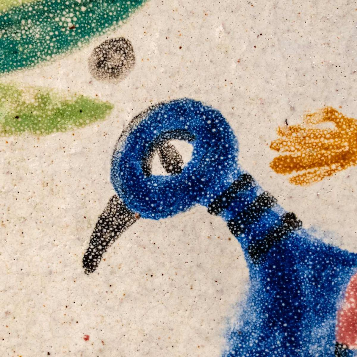 Grote wandplaat (81 cm) in geglazuurd keramiek, gemaakt door Marie-Henriette Bataille in het kader van het Atelier de Dour in de jaren 1960. De compositie is versierd met een gekleurde glazuurlaag die kenmerkend is voor de productie van het atelier. Het werk is ontworpen om als wandbeeldhouwwerk te worden opgehangen, zoals een schilderij of een prent (bevestigingspunten aan de achterkant, zie foto).