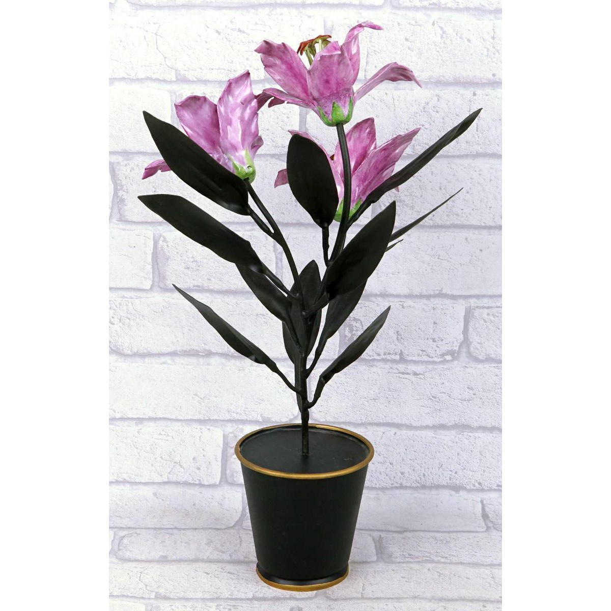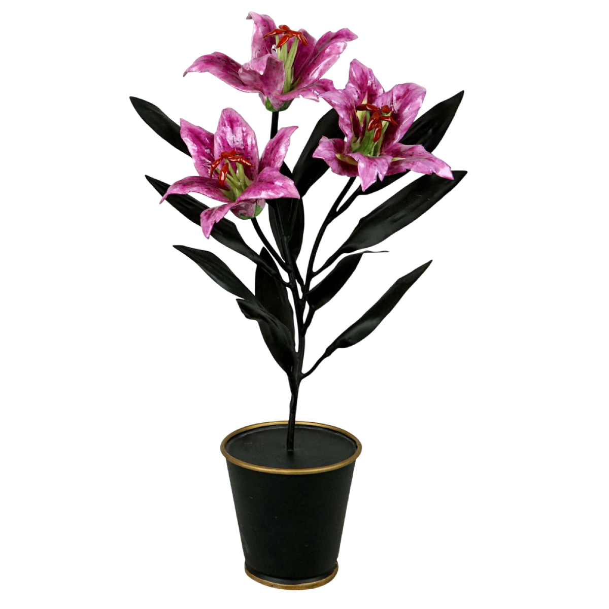 Het geheel rust in een zwart gepatineerde metalen pot, omringd door verguldsel.