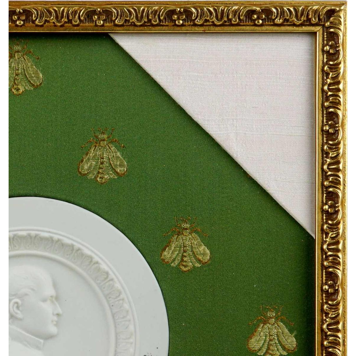 Ronde witte achtergrond, in het midden versierd met het profiel van eerste keizer NAPOLEON, hoofd naar rechts gedraaid, met een centrale band van acanthusbladeren. De lijst is hedendaags met een stoffen basis.