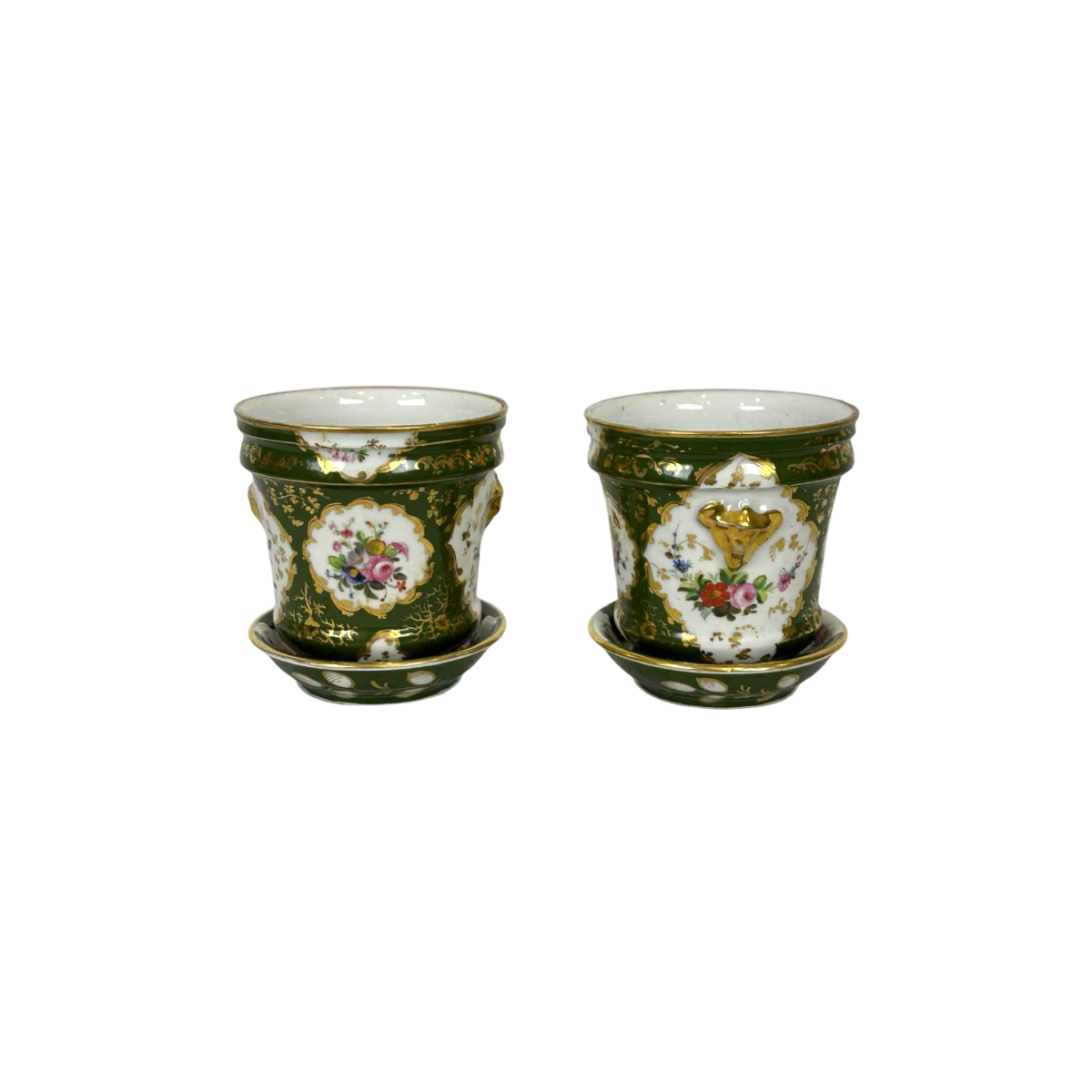 Een mooi paar diepgroene Parijse porseleinen plantenbakken met bijbehorende schotels, rijkelijk versierd met verguldsel en polychrome bloemmotieven.