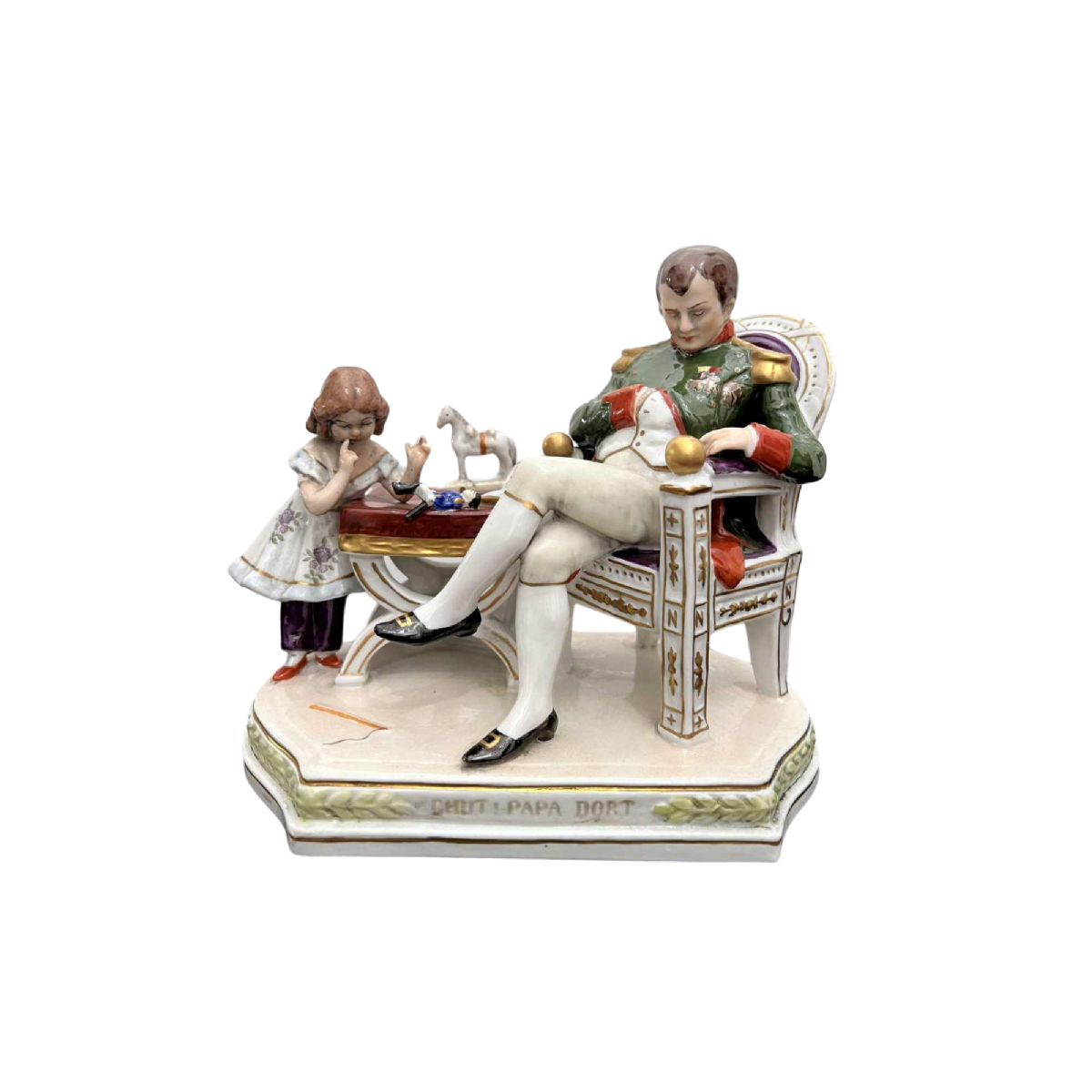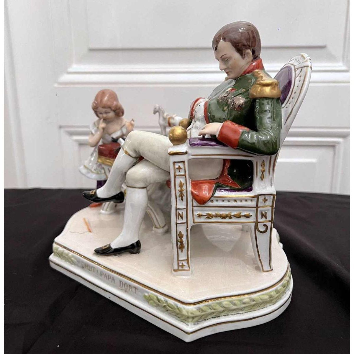 "Chut papa dort" voorstellende de zoon van Napoleon en zijn slapende vader " Modelleur Felix ZAH Getiteld "Chut Papa dort". Met het merk van de porseleinfabriek Scheibe-Alsbach.