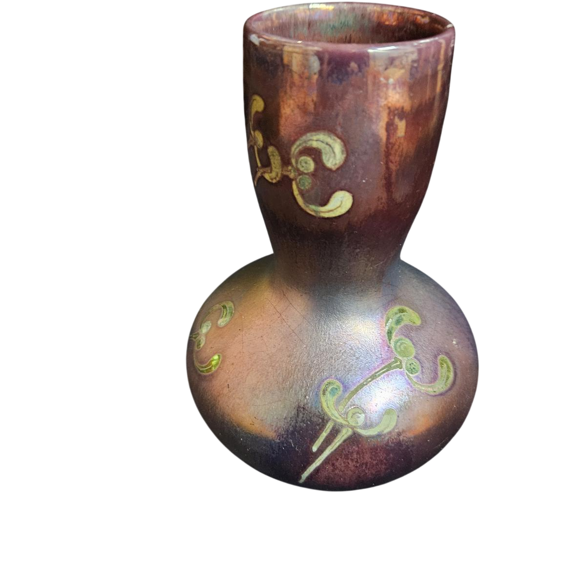 Een iriserende aardewerken vaas gedecoreerd met maretak, gesigneerd Gaziello Vallauris.
