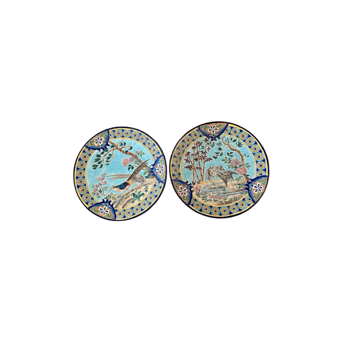 Paar art deco schotels van 32 cm, één met een afbeelding van een fazantenpaar en de andere van steltlopers.